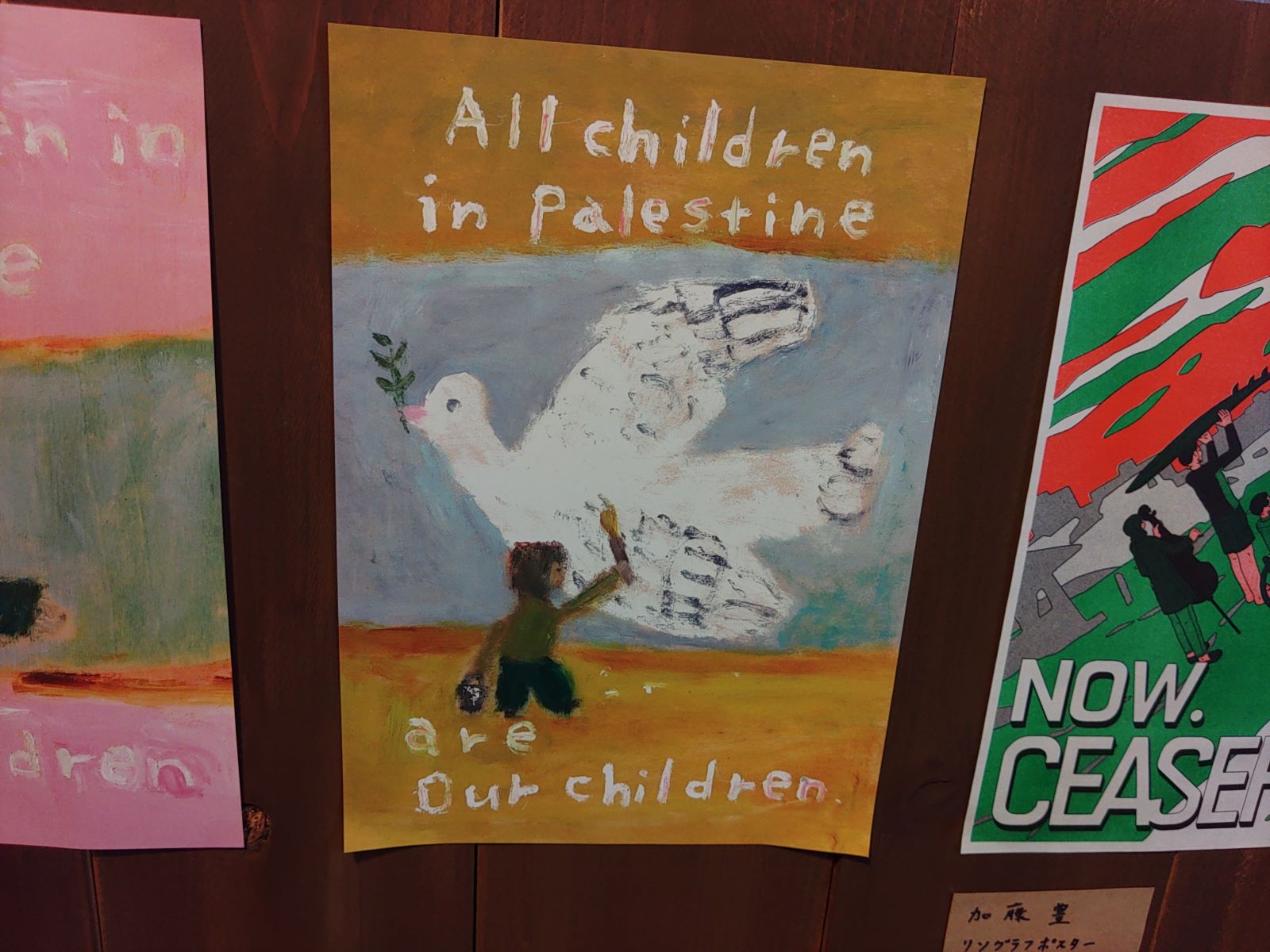 登戸駅近くのNAMNAM Spaceというところで開催されている『パレスチナ あたたかい家』と題された展覧会に行ってみました。一部屋のスペースに新進の作家のパレスチナ支援のためのいろんな絵や作品が並んでいます。このような展覧会を見に来るのは、ぼくのような、かわりもの、はぐれものの老人ばかりで、閑散としていると思いきや、それなりの人の入りで、ぼく以外は若い人ばかりであるのを、ぼくは希望と感じたのです。きっと、みんなの思いは一つ、虐殺がやむことを願うばかり。
