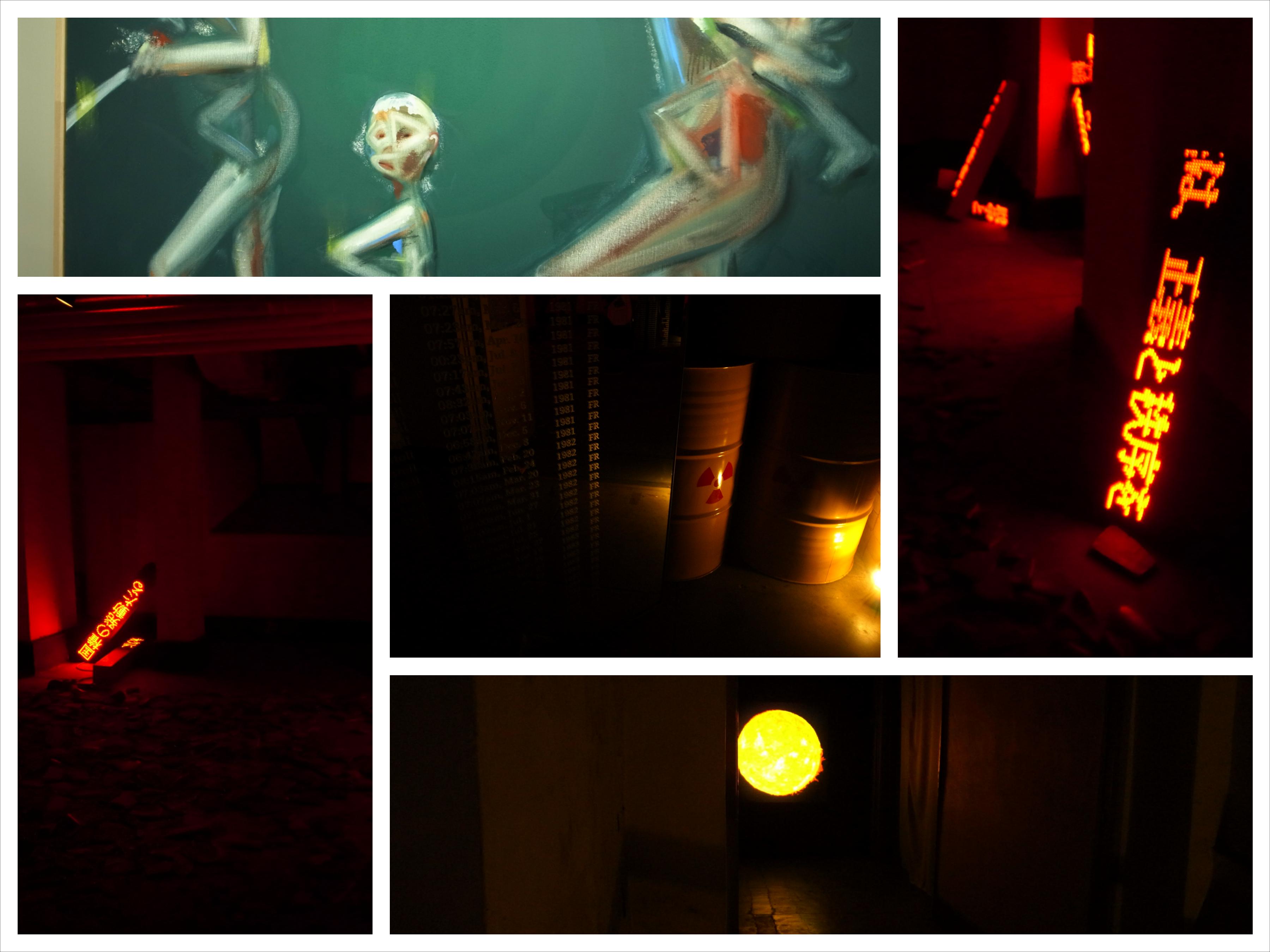 柳幸典のインスタレーションは放射能物質のマークのあるドラム缶の捨てられた廃墟の中、赤いLEDライトの古ぼけた電光掲示板に日本国憲法の九条や前文をうつし出されているというもの。この作品はぼくにはとても悲しかった。