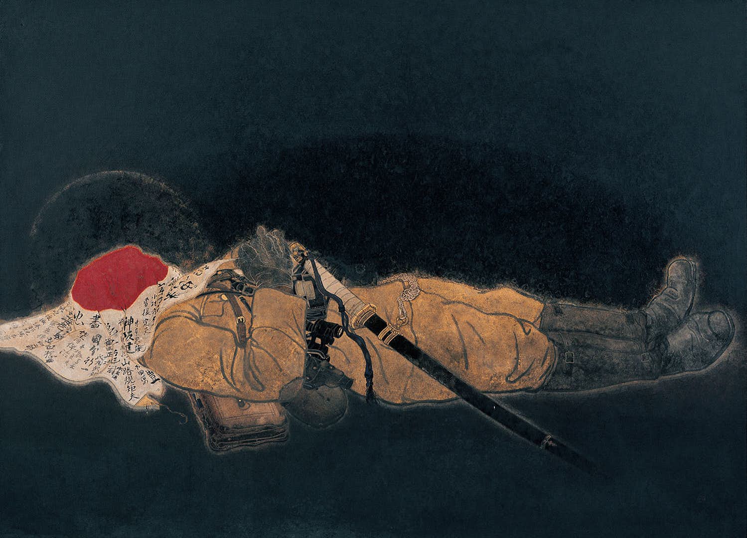 小早川秋聲が単に戦争画だけの日本画家でなく、戦争画がその残した多くの画業に一部であることを知るのだが、あまり広くはない画廊に小早川の最も有名な「國の盾」は飾られてあった。もとは「軍神」という題であったこの絵は、この絵の依頼主であった陸軍から受け取りを拒否され、その時は、桜舞う背景であったものが、戦後、幾度かの改作が小早川自身の筆によって加えられ、背景は垂らしこみという手法で黒く塗りつぶされ「國の盾」となったそうなのである。ある美術批評家はこれを平和を志向する戦後社会との妥協であるとし、ある美術批評家は兵士の真実に迫ろうとしてのことだという。