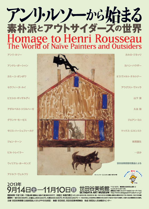世田谷美術館の「アンリ・ルソーから始まる素朴派とアウトサイダーズの世界」展を見に行く。専門の美術教育を受けないまま、ただ「描きたい」という強い衝動を持って描かれた市井の人たちの作品を素朴派とかアウトサイダー・アートと呼ばれるらしく、実は、世田谷美術館はその収集に努め、膨大なコレクションを持っており、今回の展覧会はその集大成のようなものらしい。絵画のブルーズ・マンのブルーズのようなものなのかな、と思い、見に行った。