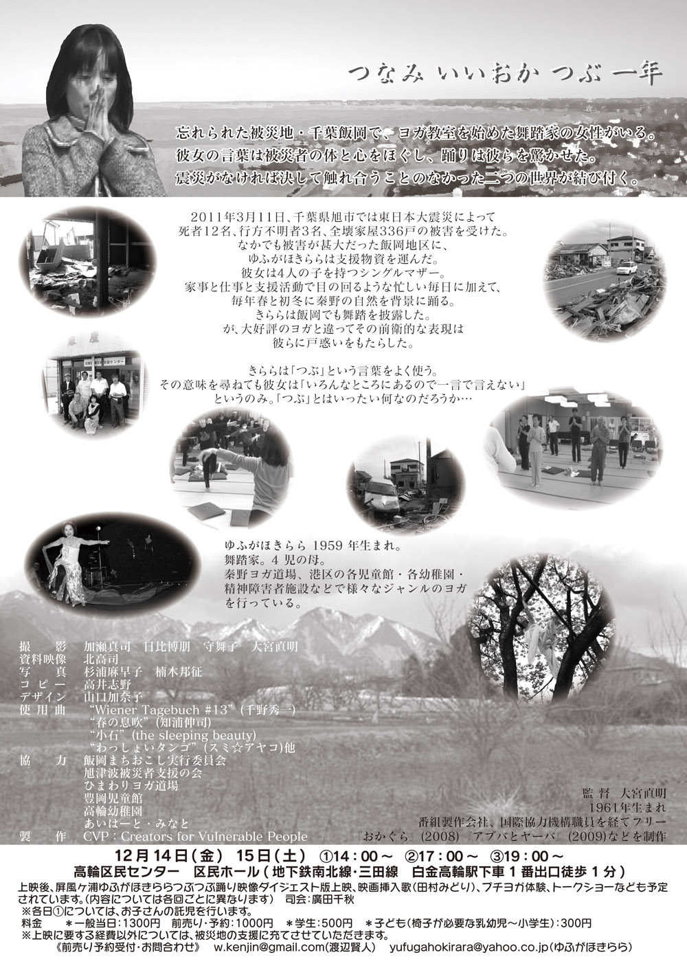 港区にある高輪区民センター区民ホールという所で大宮直明監督の「つなみいいおかつぶ一年」という映画を見た。この映画はぼくの友だちのヨガの先生であり舞踏家でもあるゆふがおきららさんを描いたドキュメンタリーであると同時に、世の中でほとんど知られていない先の地震の被災地である千葉の飯岡という漁師町を描いた作品でもある。