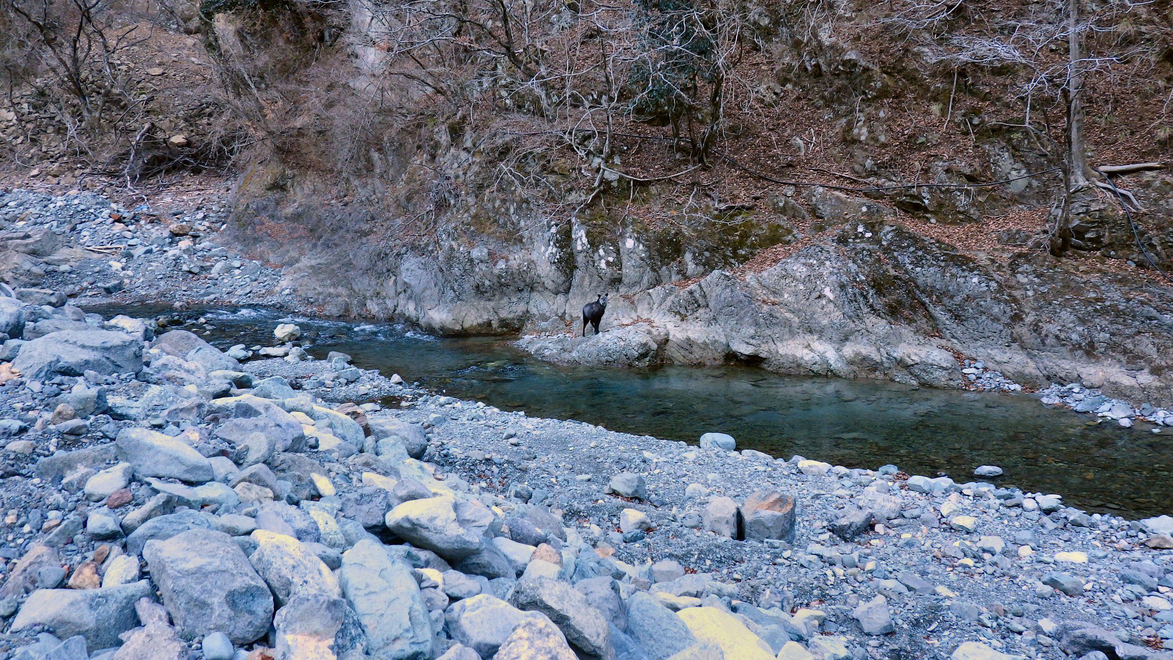 後から考えれば、人の姿を見た鹿が、非難せねばと考え、あの川の向こうの狭い岩場に行ったのかもしれず、怖がっていたのは鹿の方かもしれません。あの決して目をそらさない、大きな黒い野生の鹿の強い視線が今でも、まざまざと思い出され、忘れられません。野生の生きものは素晴らしい、そう思わずにはいられません。ぼくは夏の終わりにここで、ヤマカガシという赤い蛇を見たこともあります。そう、野生の生きものは素晴らしい。