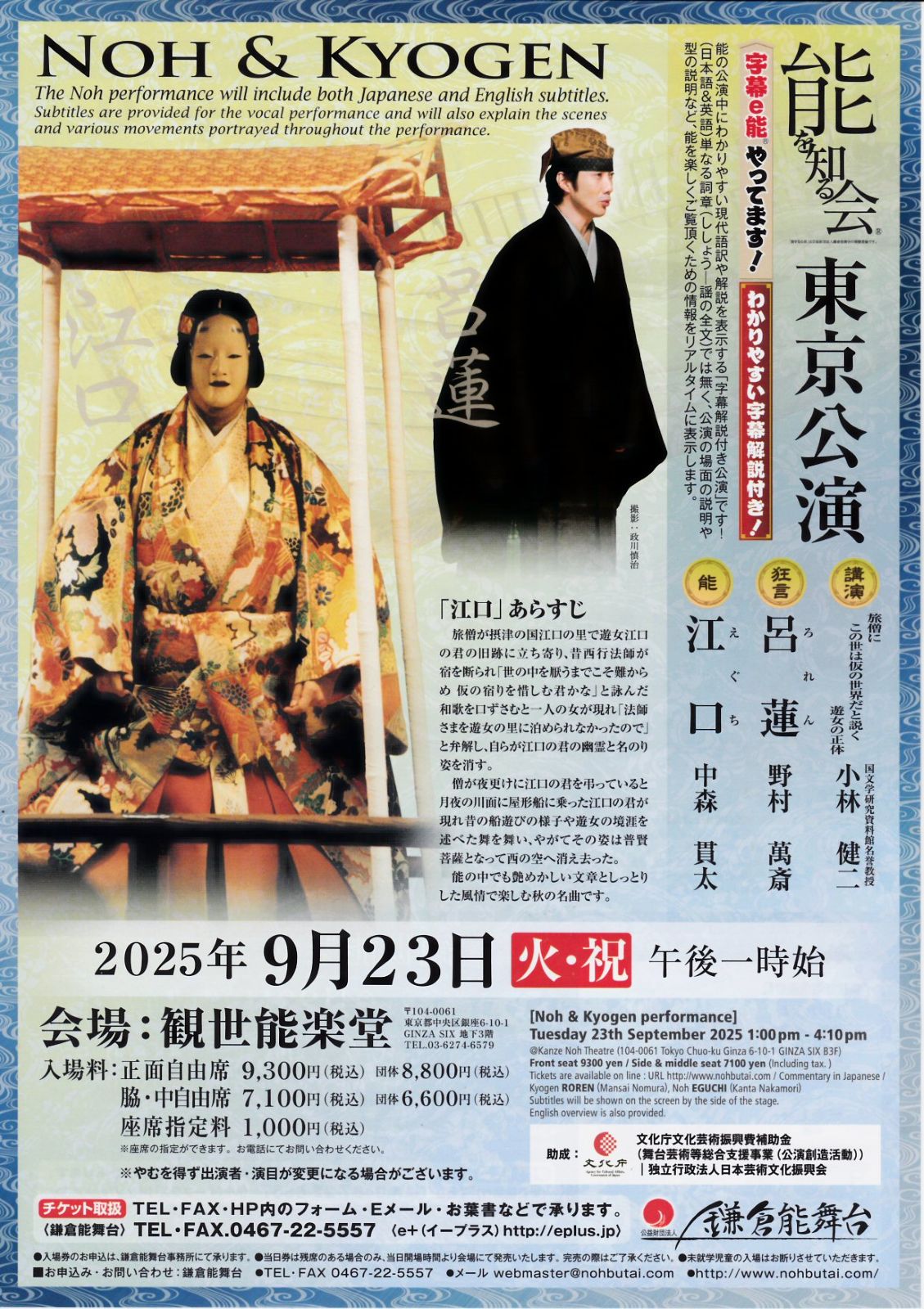 銀座の観世能楽堂で能楽を見ました。狂言は宝生流の「呂連(ろれん)」で能は観世流の「江口(えぐち)」でした。能楽の前に国文学研究資料館名誉教授の小林健二さんの解説もありました。
