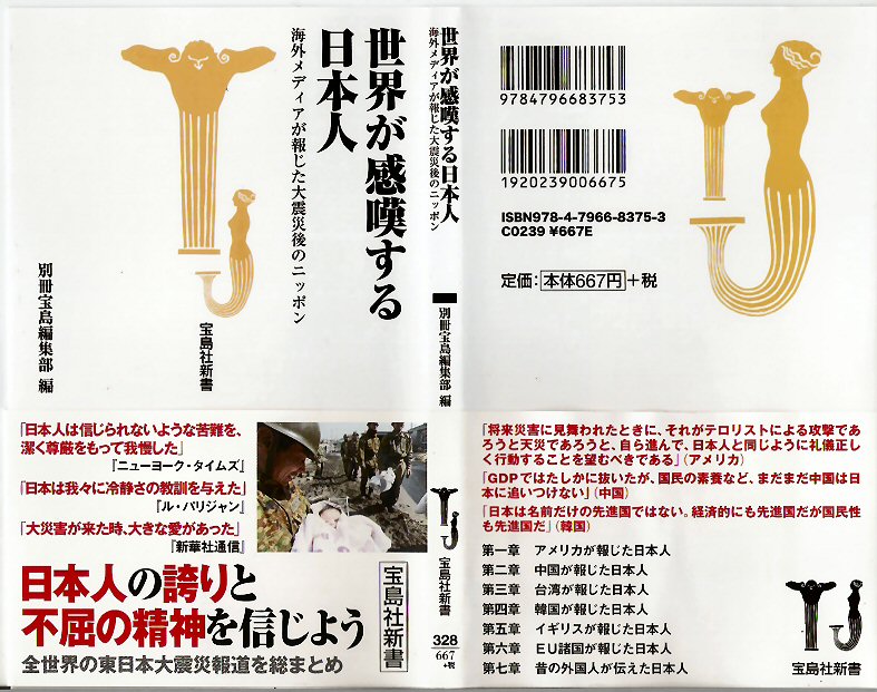 震災から一年経とうとしている今、「世界が感嘆する日本人」という本を読んだ。さまざまな海外メディアの特派員が震災後の日本の庶民の立ち振舞いを伝えていて、それは感嘆され、賞賛され、敬意を持って報道されていたりする。そのようなことがこの本にはまとめられてあった。