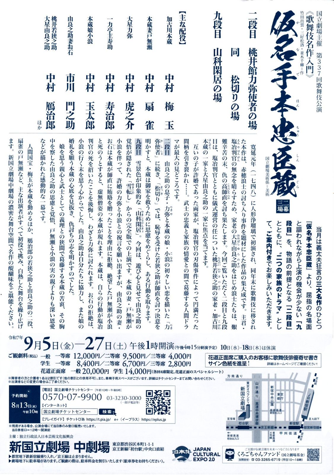 新国立劇場の中劇場で歌舞伎を見ました。初めての歌舞伎の観劇です。役者は敬称を略させていただき、中村梅玉、中村鴈治郎、中村扇雀、市川門之助、中村虎之介、中村玉太郎、中村寿治郎らの面々。演しものは仮名手本忠臣蔵の二幕三場で、二段目から「桃井館力弥使者の場」と「松切りの場」、九段目の「山科閑居の場」。