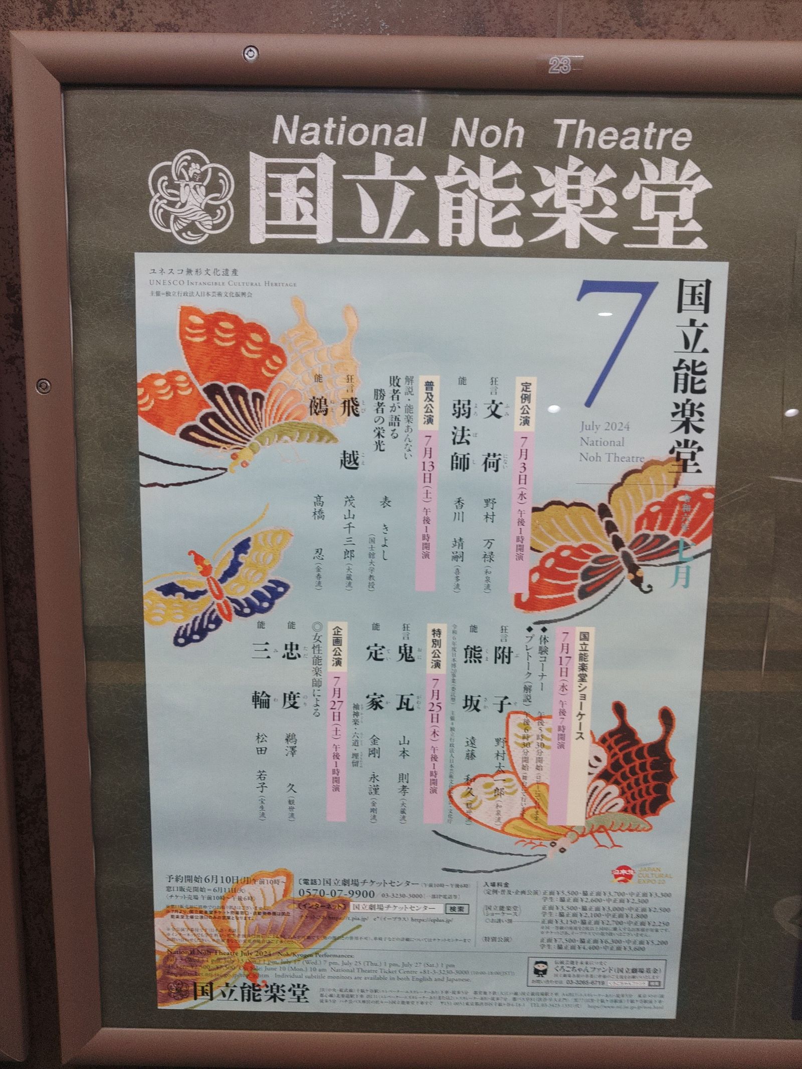 国立能楽堂で能楽鑑賞をしました。狂言は「文荷(ふみにない)」、能は「弱法師(よろぼし)」。