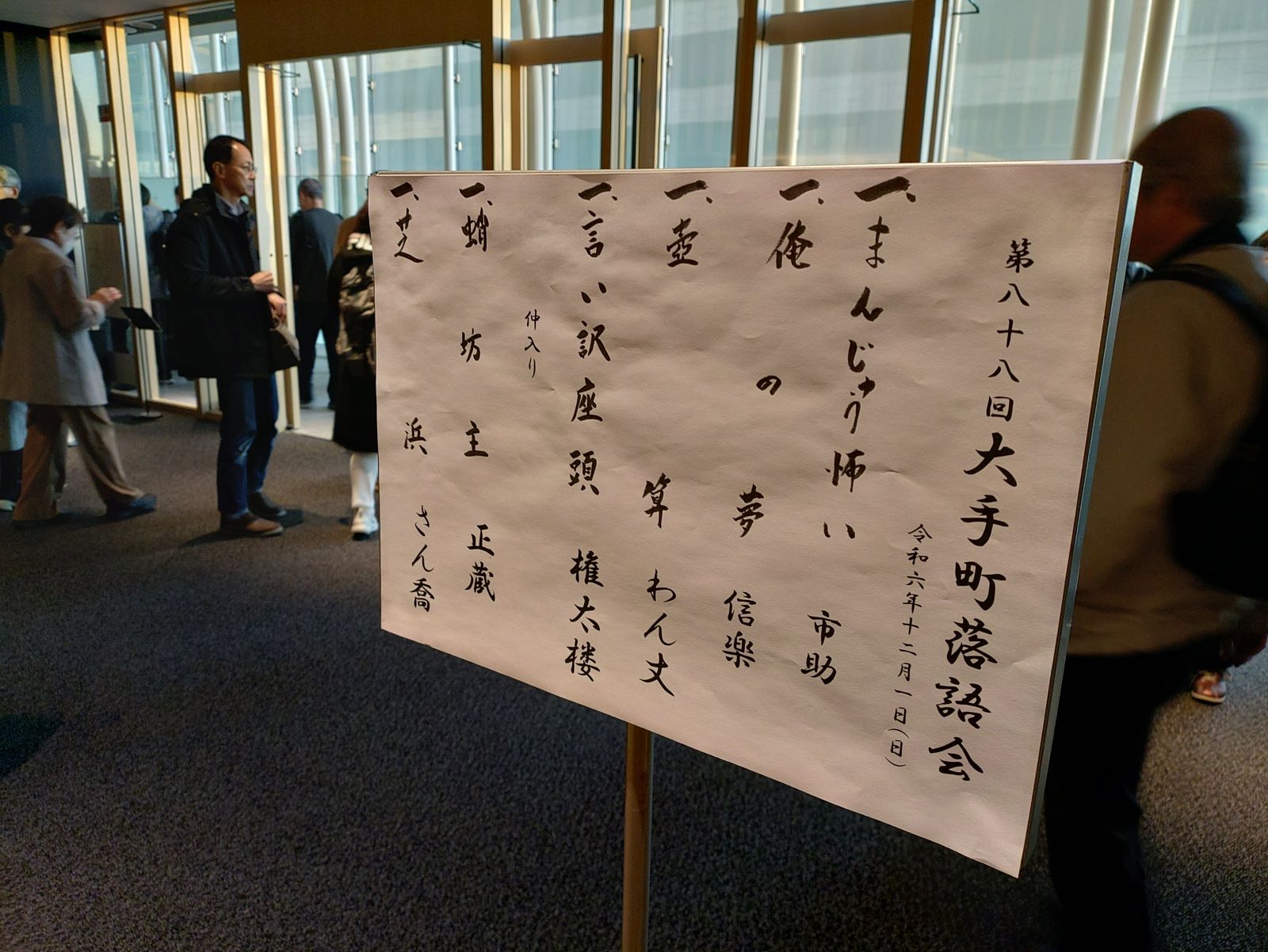 大手町の日経ホールで「第八十八回大手町落語会」を見ました。見た演目を記します。前座の柳亭市助くんの「まんじゅう怖い」、二つ目の柳亭信楽くんの「俺の夢」、三遊亭わん丈師匠の「壺算」、柳家権太楼師匠の「言い訳座頭」で仲入りとなりました。林家正蔵師匠の「蛸坊主」、主任は柳家さん喬師匠で「芝浜」。
