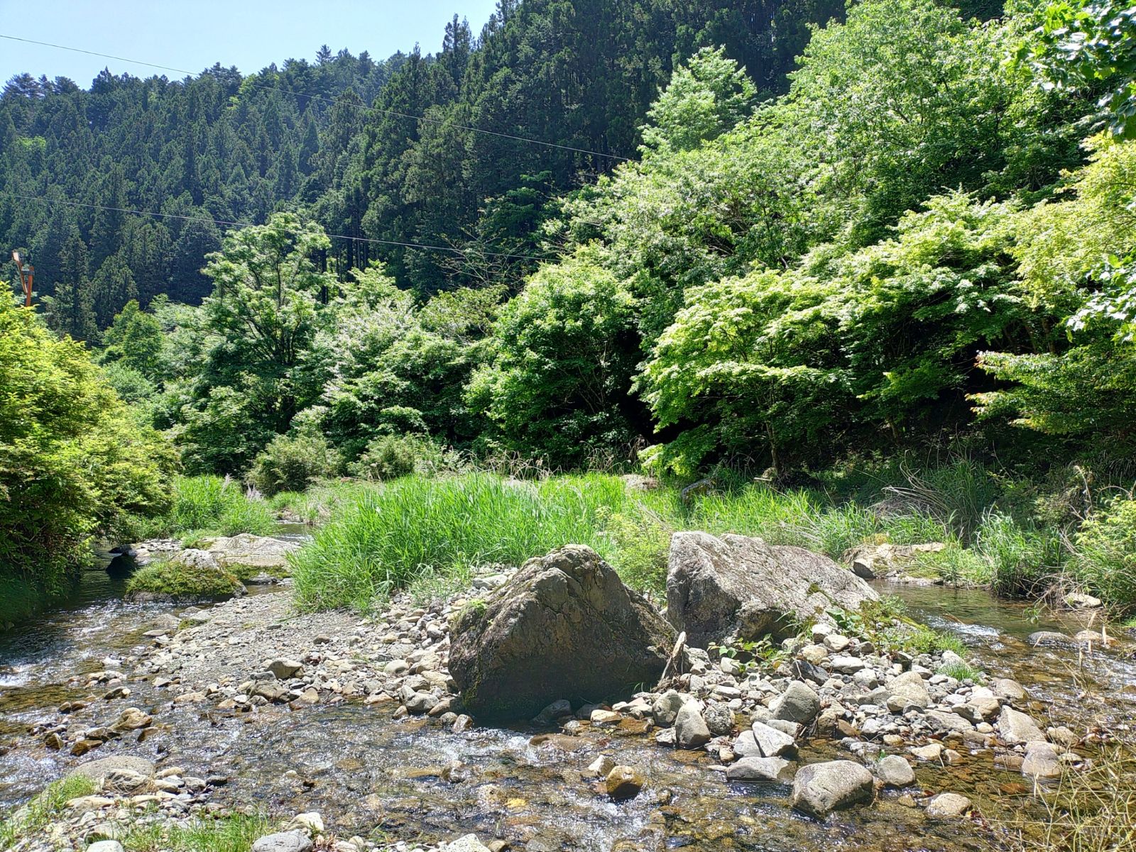 なかなか入渓ポイントが見つからず、下流に向けて川沿いの舗装された道をずいぶん歩いてしまいました。ロープが垂れ下がっているところがあって、ここが入渓ポイントだと思って、ロープをつたって、尻もちをつきながら、やっと渓谷の川辺に入ります。あたりは深山幽谷の気が満ちております。ぼくは熊よけの鈴を鳴らし、熊よけのホイッスルを何度か鳴らします。しばらく歩けど、魚影は見えず、未熟者のぼくには魚の気配も感ずることができません。仕方なくボーズ(一匹も釣れないこと)だけれど、入渓したところに戻り、ロープをつたい、土手をよじ登るようにして、退渓しました。