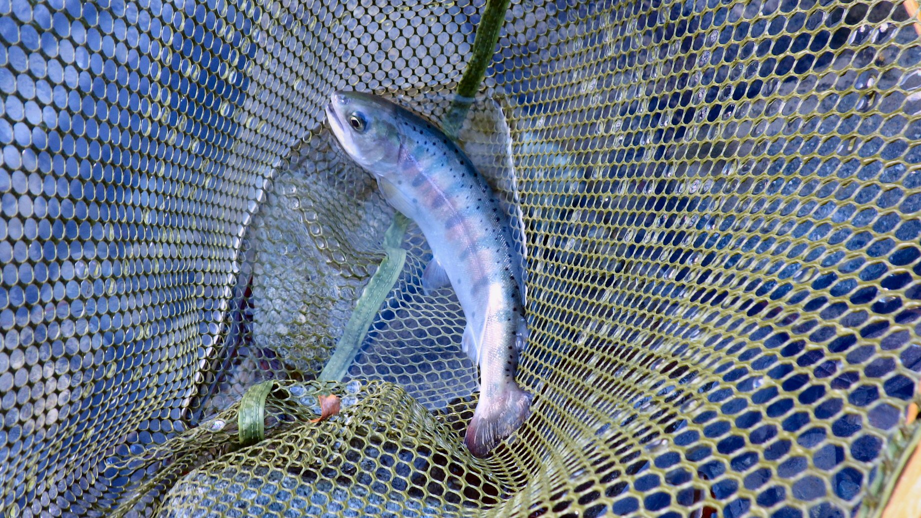 もう竿をしまおうかなと思った時に、強い引き。ぼくは竿を立てたり、フライラインをたぐったりて数分間、魚との綱引きをしていました。魚が見えるとかなり大きい精悍な虹鱒で、ぼくのランディングネット、リス捕りあみ(フライフィッシングをする人のための網で人気商品)に入るか入らないかの大きさで、リス捕りあみは長い方の内径が28センチなので、この虹鱒は尺越えではないか。