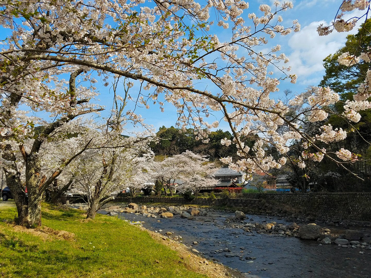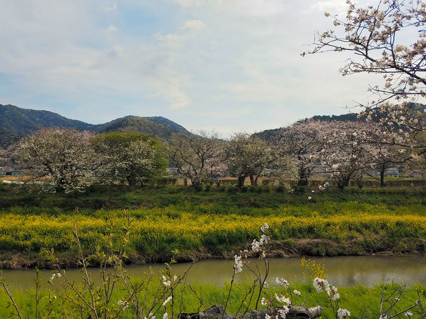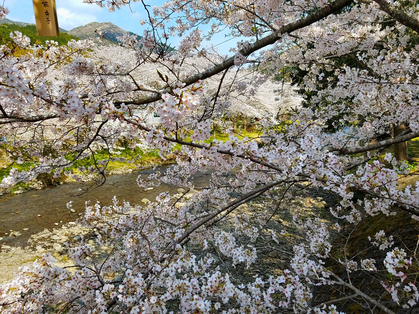 車に折りたたみ自転車を乗せて、いつも旅に行く松崎町に向かいました。松崎町に旅するたびに松崎町を流れる川、那賀川の川沿いにはたくさんの桜の木が植わっていて、6キロメートルにわたる桜並木で春の桜の花咲く季節にはどんなだろう、と思っていたのです。自転車で旅の地の桜の満開の川沿いを走ってみたのです。これは楽しい。とてもきれいです。