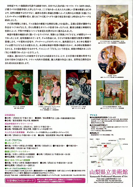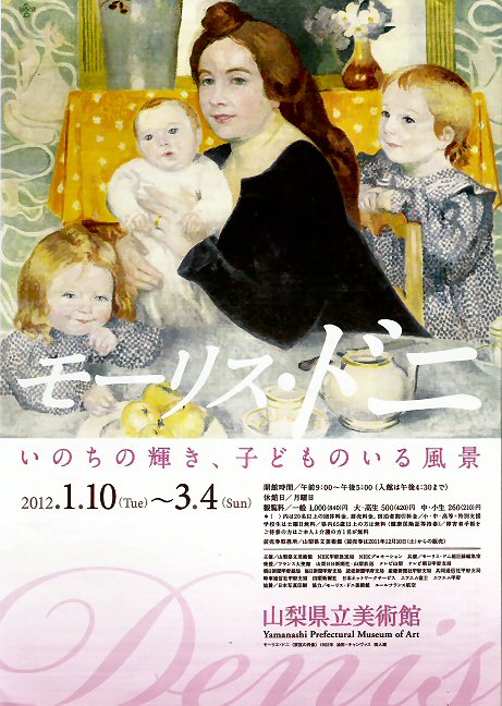 山梨の方へドライブしに行ってふらりと山梨県立美術館に立ち寄った。ここで、よく知らないフランスの画家、モーリス・ドニという人の展覧会が開かれていて、入ってみた。この展覧会は「モーリス・ドニ いのちの輝き、子どものいる風景」とタイトルを付けられているのだけど、モーリス・ドニという人は、19世期末から20世紀を生きた人で、教会に飾られる宗教的な題材の絵画を描いた人で、その人が、たくさんの家族、母や子どもたちの絵を描いてもいる。敬虔なカソリックのクリスチャンだったというドニの宗教的な絵画にも自らの、もしくは、近しい子どもたちが描かれている。