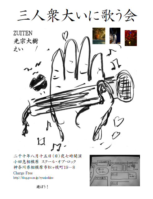 明日、2010年8月15日(日)の夜19時ぐらいから、小田急相模原のSchool Of Rockで弾き語りで歌っています。この夜はZUITENさん、光宗大樹さんとぼく。さて、どんな歌だ飛び出すか?