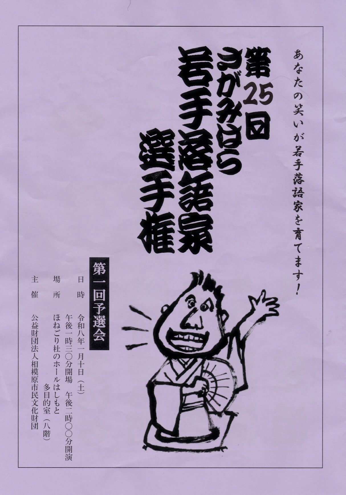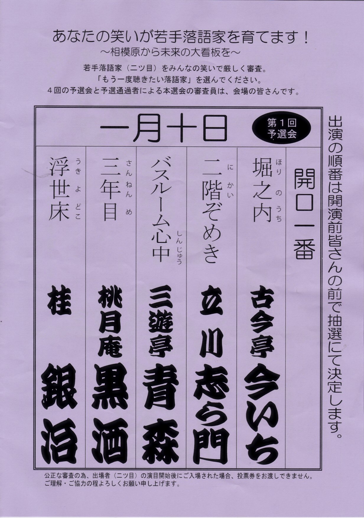 第25回さがみはら若手落語家選手権の第1回予選会を見に行きました。見た演目を記します。前座 春風亭昇ちくくんの「真田小僧」、二つ目の立川志ら門くんの「二階ぞめき」、二つ目の桃月庵黒酒くんの「三年目」、二つ目の古今亭今いちくんの「堀之内」で仲入りです。二つ目の桂銀治くんの「浮世床」、二つ目の三遊亭青森くんの「バスルーム心中」でした。