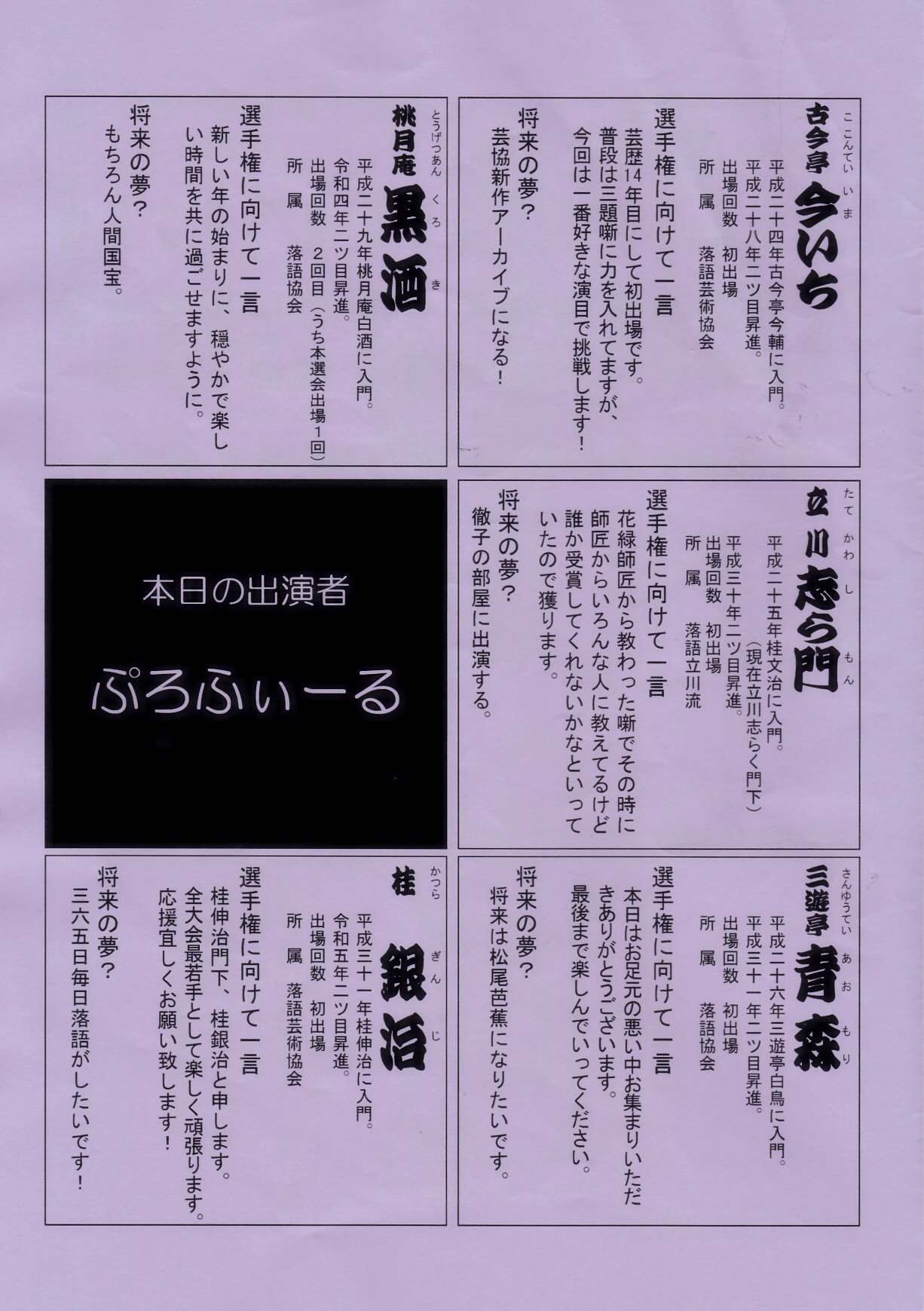 選手権ということで、ぼくにも投票権が与えられておりまして、桂銀治くんの「浮世床」と三遊亭青森くんの「バスルーム心中」でどちらにしようか、とずいぶん悩みましたが、桂銀治くんに投票しました。集計の結果は、桂銀治くんの「浮世床」が一位となり、三遊亭青森くんの「バスルーム心中」が二位でありました。桂銀治くんが本選に出場が決的し、三遊亭青森くんがその可能性を残す、という結果となりました。普段の寄席ではあまり見ることのない二つ目の人たちの噺におおいに笑ったのであります。