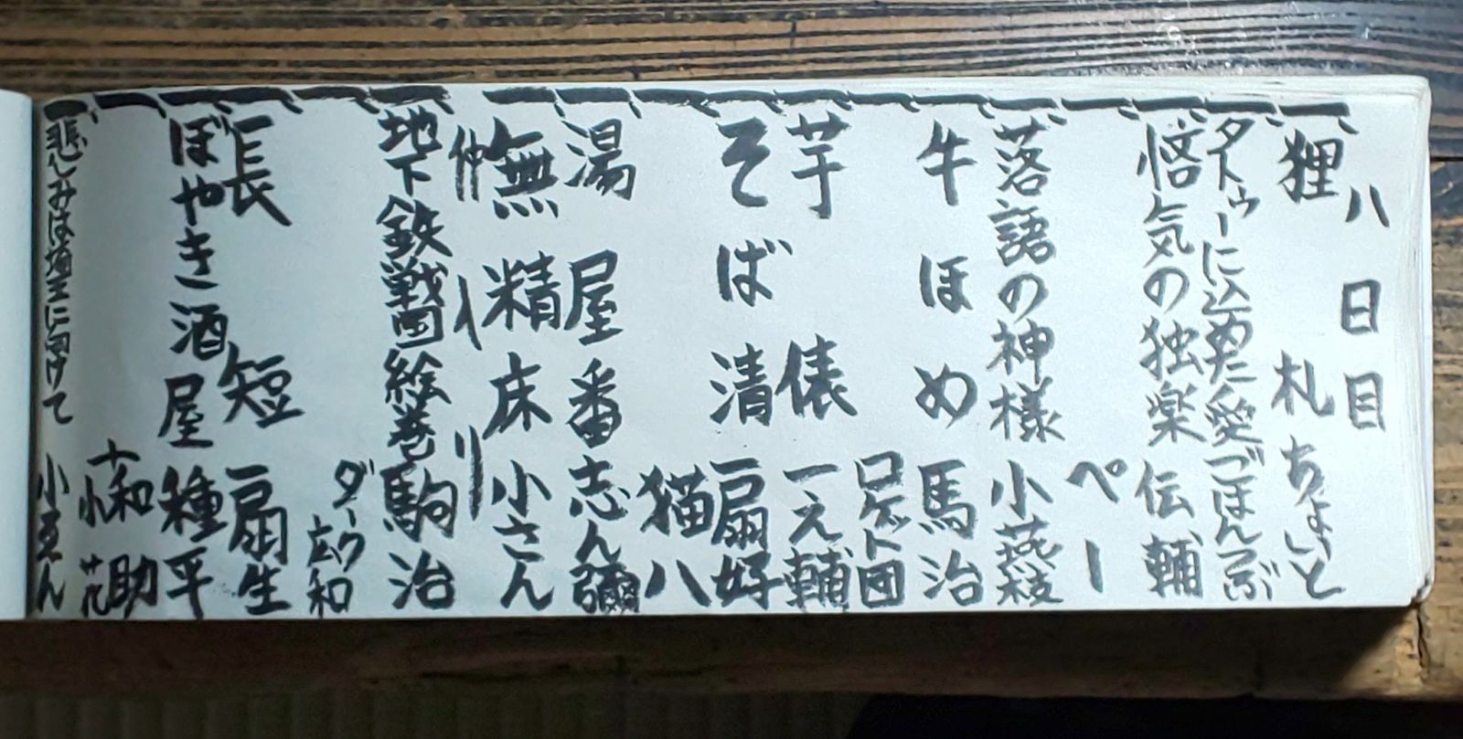 三月十八日、新宿末廣亭にて令和八年三月中席昼の部です。いつものように見た演目を書き記します。前座の柳亭ちょいとくんの「狸札」、二ツ目の三遊亭ごはんつぶくんの「タトゥーに込めた愛」、古今亭伝輔師匠の「悋気の独楽」、林家ペーさんの漫談、柳亭小燕枝師匠の「落語の神様」、金原亭馬治師匠の「牛褒め」、ロケット団のお二人の漫才、春風亭一之輔師匠の「芋俵」、入船亭扇好師匠の「蕎麦清」、江戸家猫八さんの動物物まね、古今亭志ん彌師匠の「湯屋番」、柳家小さん「不精床」でお仲入りとなりました。古今亭駒治師匠の「地下鉄戦国絵巻」、ダーク広和さんのマジック、桂扇生師匠の「長短」、林家種平師匠の「ぼやき酒屋」、翁家社中のお二人の太神楽曲芸、主任は柳家小ゑん師匠の「悲しみは埼玉に向けて」でした。