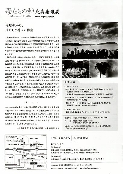 静岡県三島のクレマチスの丘にあるイズ・フォト・ミューゼアムに沖縄の久高島で行われた祭祀、イザイホーを1978年に写真に納めた写真家、比嘉康雄の展覧会「母たちの神 比嘉康雄展」に行ってきた。ちなみに12年に1回行われるイザイホーは1978年以来行われていない。ノロと呼ばれる沖縄の最高位の神官は女性で、男子禁制のこの祭りを写真に撮れたのは、比嘉が西銘シズさんあらたまって外間ノロさんから「あなたのように熱心にシマに通ってくる人はいなかった。久高島の祭祀も私たちの代で終わるかもしれないのでしっかり記録してほしい」との許しがある時出たからだという。沖縄のおばんのやわらかいやさしさを感じる話。