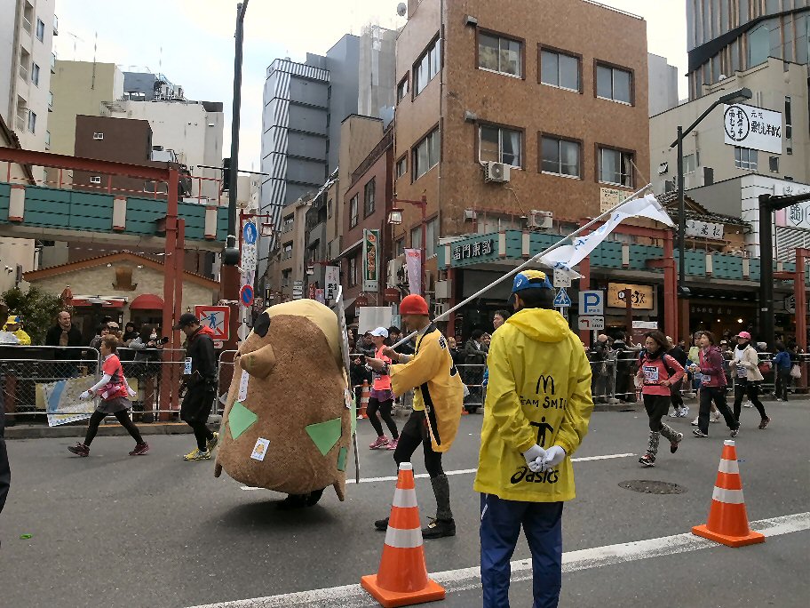 雷門の前で東京マラソンを見物して、変なかっこうをして走っている人を見ては笑った。
