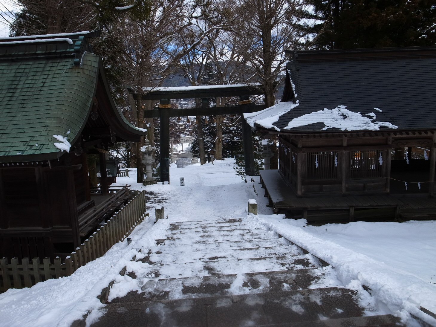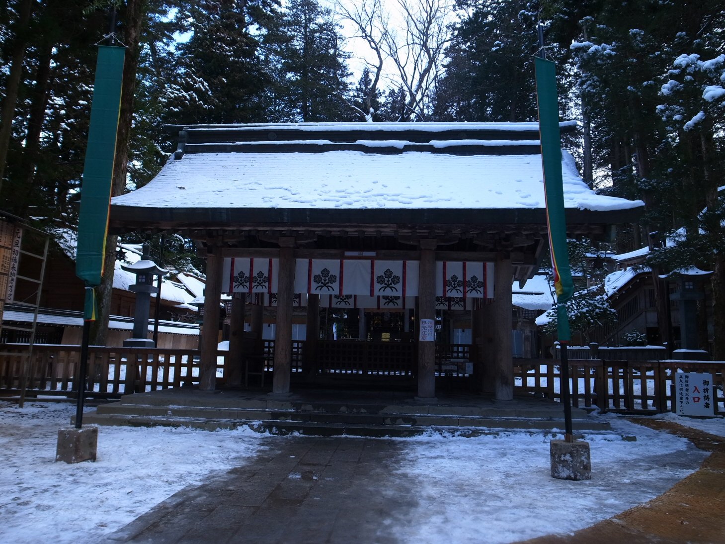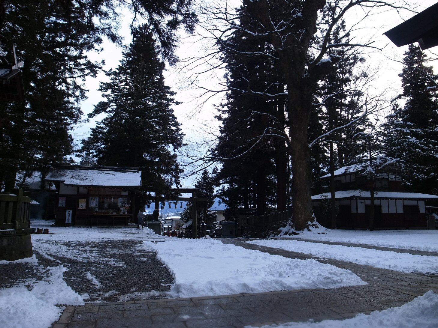 茅野の駅を降りて、諏訪大社上社前宮に向かいます。小高い所に雪につつまれたある古い社です。
