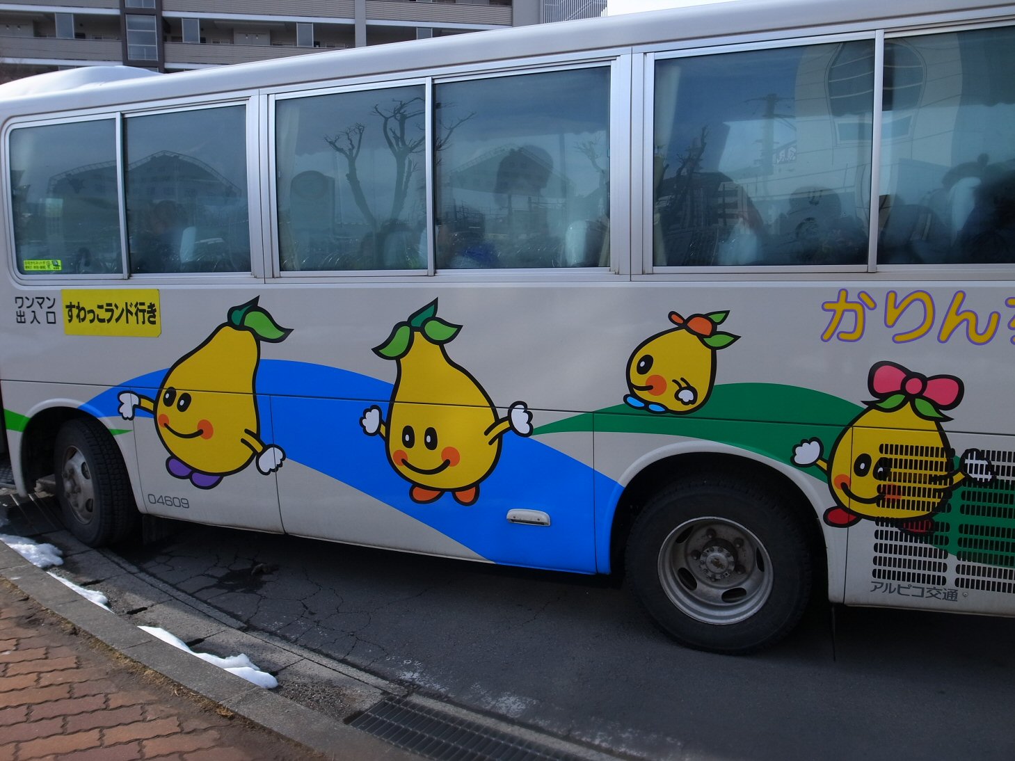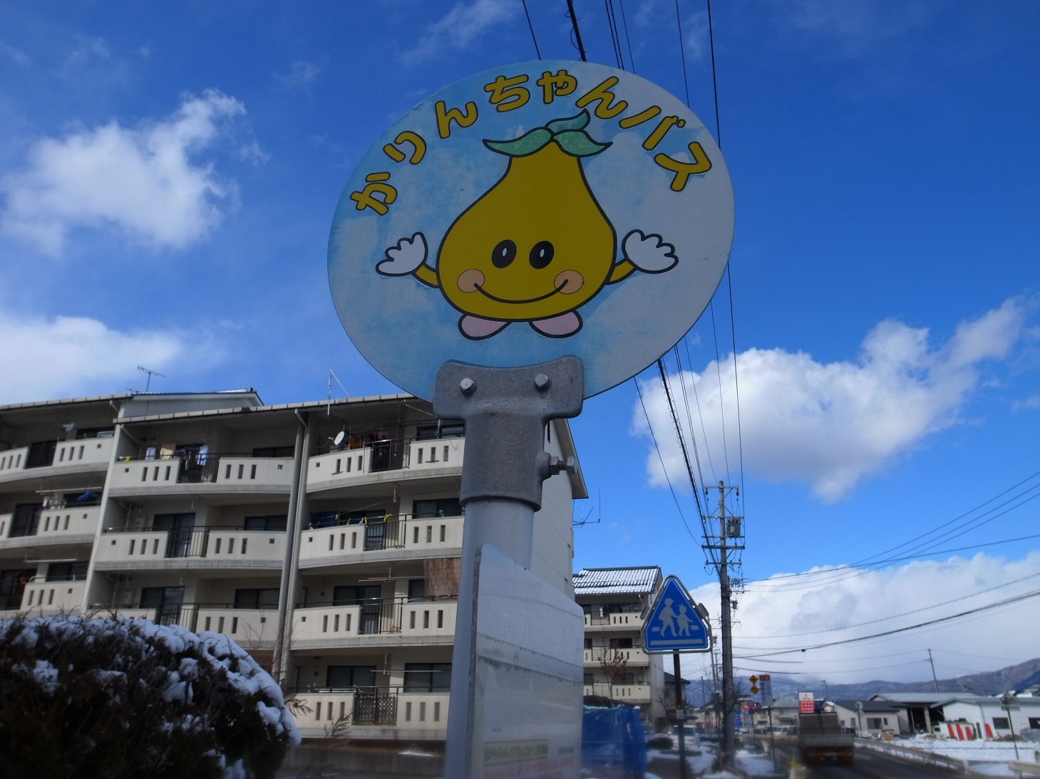 てくてく、上諏訪に駅に向かって歩いていると、かりんちゃんバスというバス停を見つけ、バスが来るのをしばらく待って、バスに乗った、小学生がたくさんで、スクールバスのようでした。