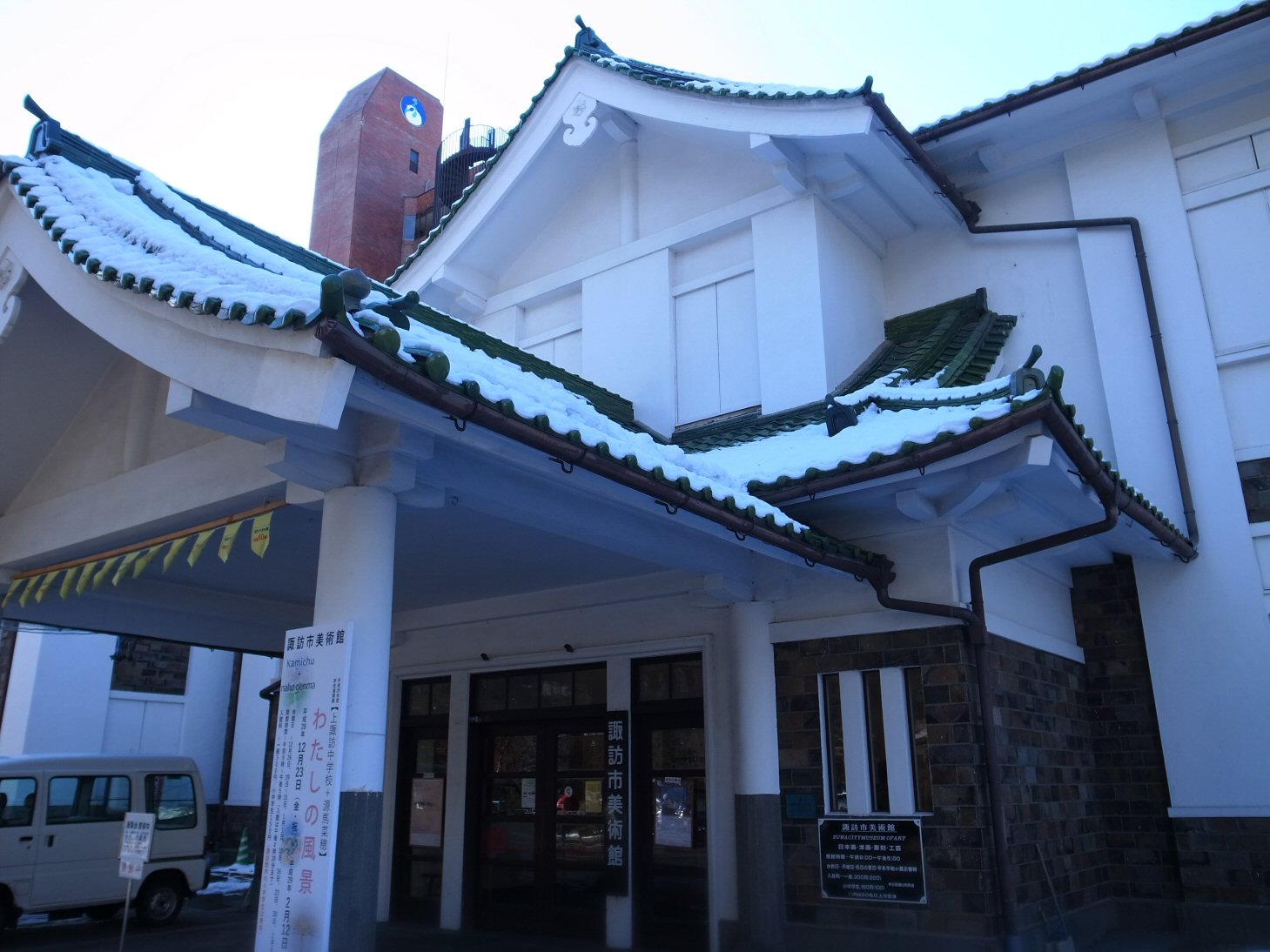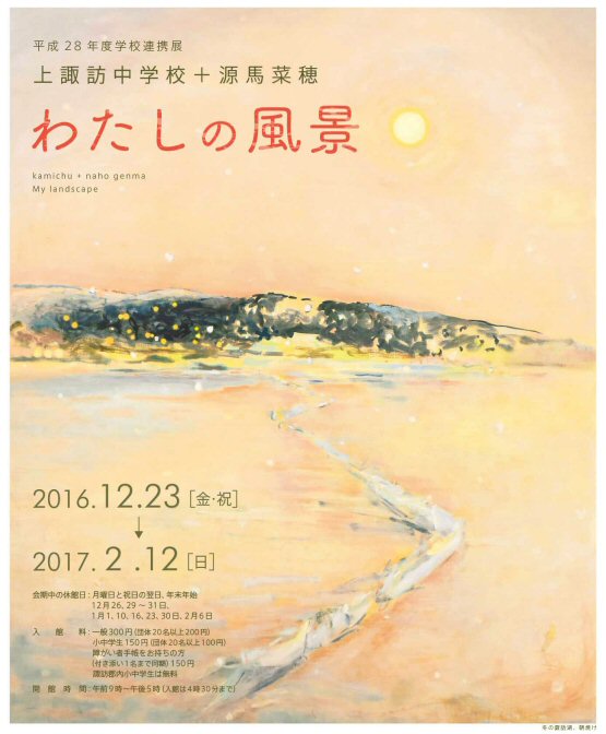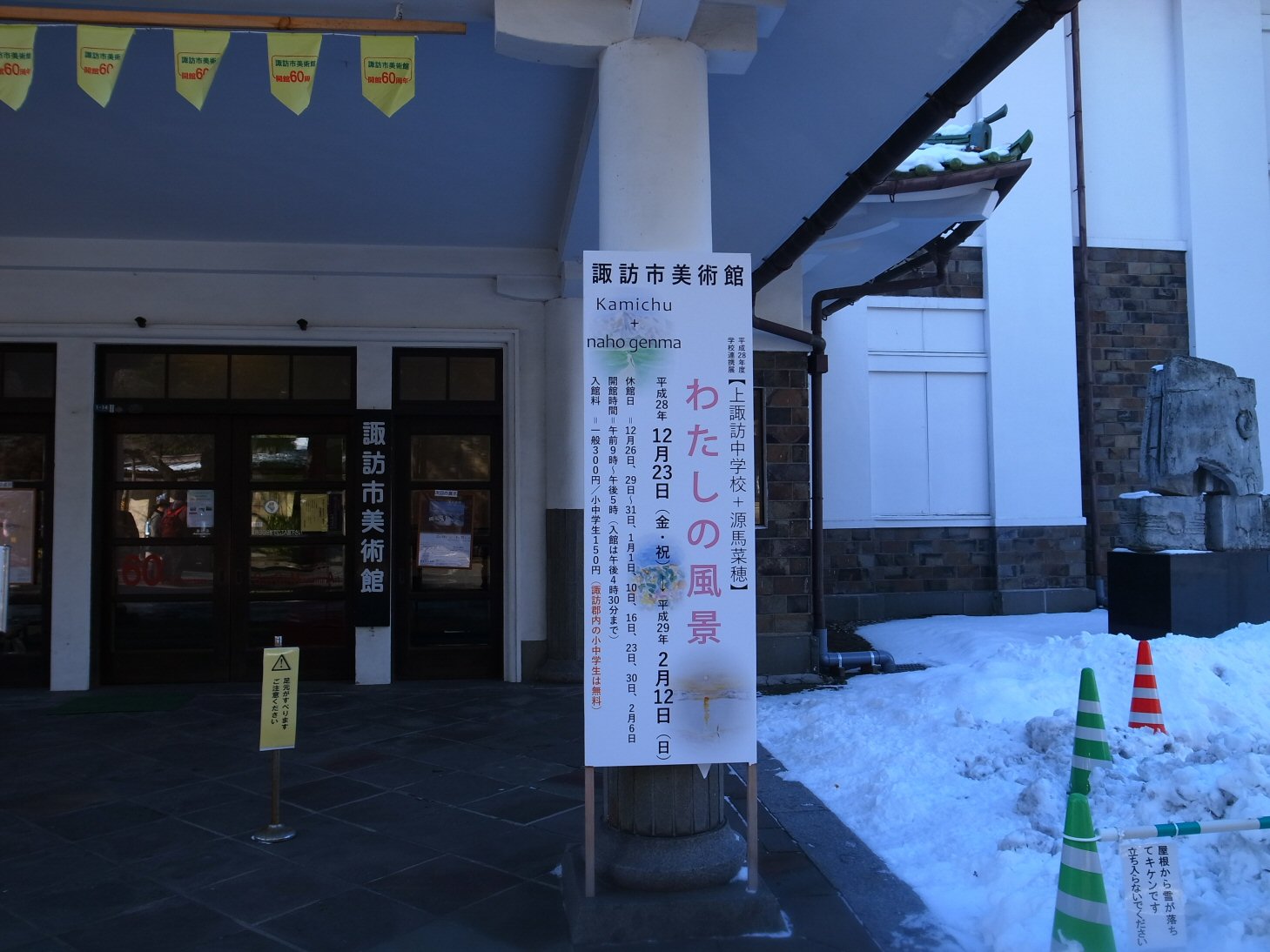 次の朝、もしかして、御神渡りが見れるのではないかと思い、諏訪湖の湖畔に行ってみましたが、神さまの逢瀬のあとは見れませんでした。けれど、湖畔を歩き、古い明治時代の建物の諏訪市美術館に入ると「上諏訪中学校+源馬菜穂 ―わたしの風景―」と題された展覧会が開かれ、そこに源馬菜穂さんの美しい御神渡りを描いた絵を見ました。とても良かった。