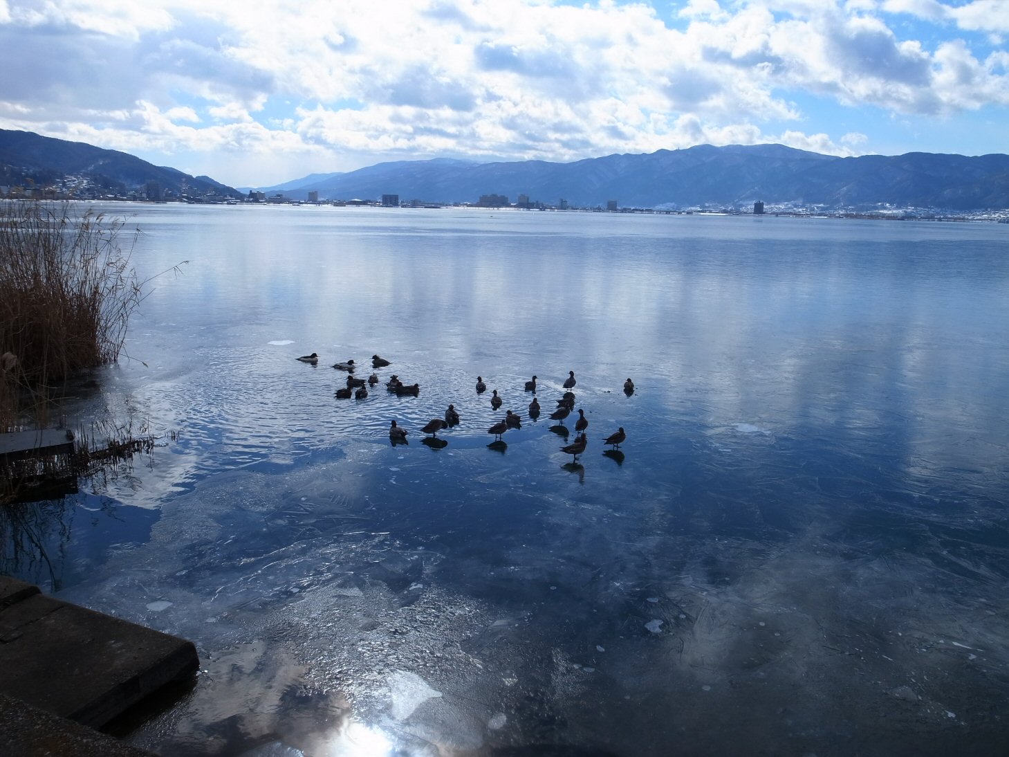 下諏訪の駅から上諏訪の駅に戻る。夕方、宿に入り温泉につかり、街も近くなので、居酒屋の夕食を食べに、お酒を飲みに出かけました。入ったのは「ばんや」という居酒屋で、諏訪大社のお神酒ともあなる日本酒「真澄」を飲みながら、鹿肉や馬肉を食します。そこで、右となりにいた、日本のグラフィックデザインのくわわけでもあり、数々の居酒屋についての本も著している太田和彦さんにそっくりな人に声をかけられて、楽しくおしゃべりもしていました。山が好きだといっていたその人は、ぼくがあこがれもする太田和彦さん、その人かも知れず、諏訪大社、御柱祭、御神渡り、はてや、長野県の予防医学についてお話を聞かせていただきました。長野県の予防医学を進めた若月俊一医師は頼まれもせず、いろんな村を訪れ、予防の医学を説き、今では長野は日本一の長寿県です。そして、気候が暖かくなりここ数年は見られていない御神渡り。「御神渡り」と書いて、「おみわたり」と読みます。諏訪湖全面が凍結し、氷上に上社から下社までつづくせりあがった氷の道ができるそれを、上社の男の神さまが下社の女の神さまに会いにいったしるしだと伝わっています。ありとあらゆるところに神さまの顕現を見てきた日本人。そういえば、子どもの頃は冬はもっと寒くて、毎朝、霜柱が神奈川県でも立っていたように思い出します。あの太田和彦さんに似た人は、もう一軒、顔を出したい店があると言い置きして、出ていきました。やっぱ、太田和彦さん、その人だったのかな?