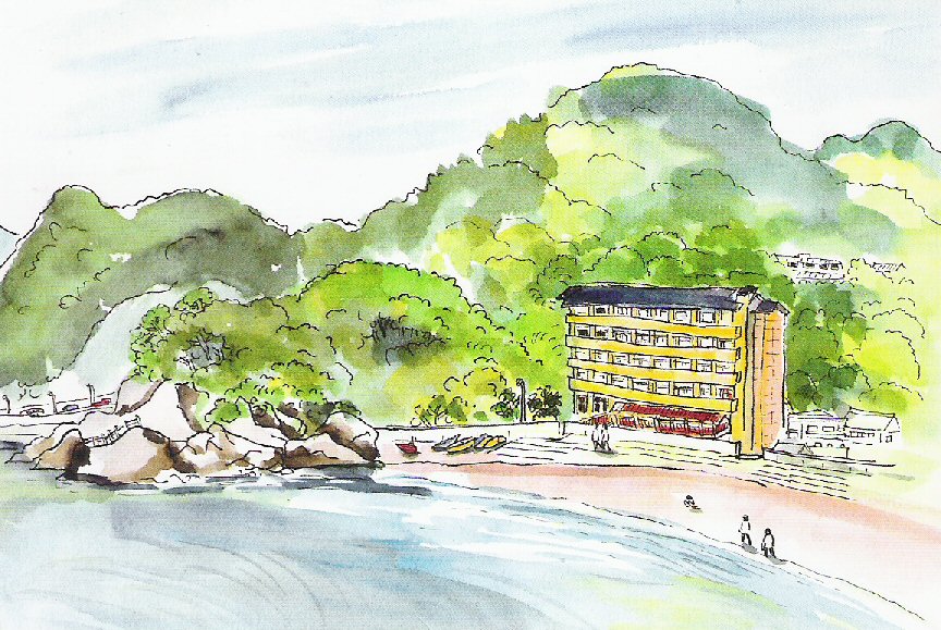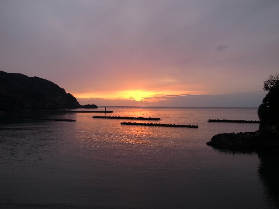 午後三時に国民宿舎伊豆まつざき荘に当宿し、温泉に浸かり、湯上がりにずっと、沈む夕日に見とれていました。まるで、三島由紀夫の小説「潮騒」にでも描かれていたかのような、いくら見ても見あきることのない美しい絵のような光景でした。しかも、ひいてはかえす波の凪の音ばかりの静けさに、心がどこかとても安らかで平和なところへつれていかれるかのようです。その言葉では言えない静けさ・・・