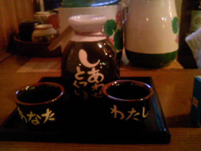 ふらりと入った「らくだ」という居酒屋か当り。沖縄民謡が流れていた。座ったカウンターのその目の前に徳利とお猪口が飾られている。