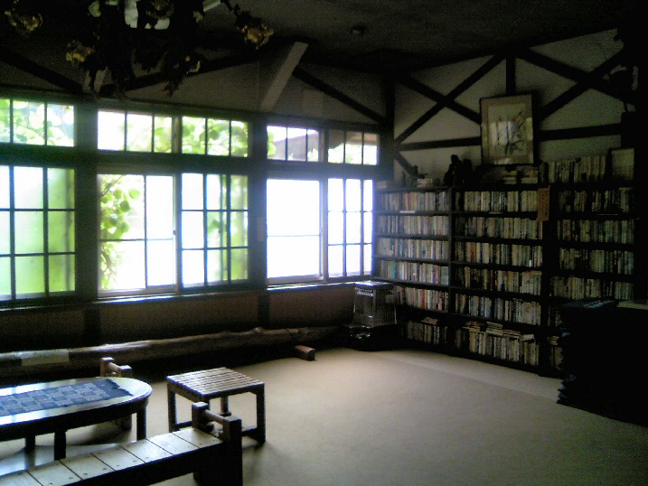 お風呂に入った後、小さい昔の小学校の中をぶらぶらする。昔の理科室だったらしいところが、談話室というのになっている。たくさんの本も本棚にあった。そして、またぶらぶら、廊下の外からけろけろの鳴き声がする。けろけろ、けろけろ。もりああおがえるだそうだ。天然記念物。けろけろ、けろけろ。