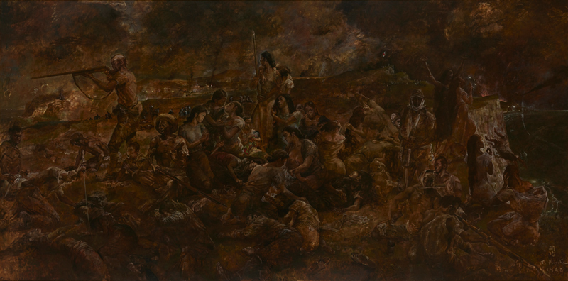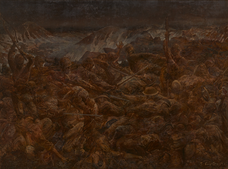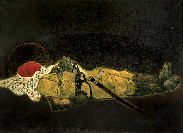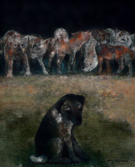 藤田は画家仲間や批評家の言葉の暴力により一人、戦争協力の汚名を被るようにして、なかば国外追放。フランスでフランス人として客死。小早川秋聲は終戦時、戦犯として捕らえられることを覚悟していたという。小早川は戦後、長く患い、大作は描かないようになり、依頼された小さな不動明王などをほそぼそと描いて過ごしていく。「アッソ島爆撃」で日本軍の爆撃機を描いたシュールレアリストの小川原修は、戦争協力の咎により戦後、美術文化協会を除名となり、生まれ故郷の北海道に戻り、ほそぼそと絵を描きつづるける。その戦後の作品「群れ」は傑作で、小川原の胸の内を生々しく吐露しているかのようなのだ。