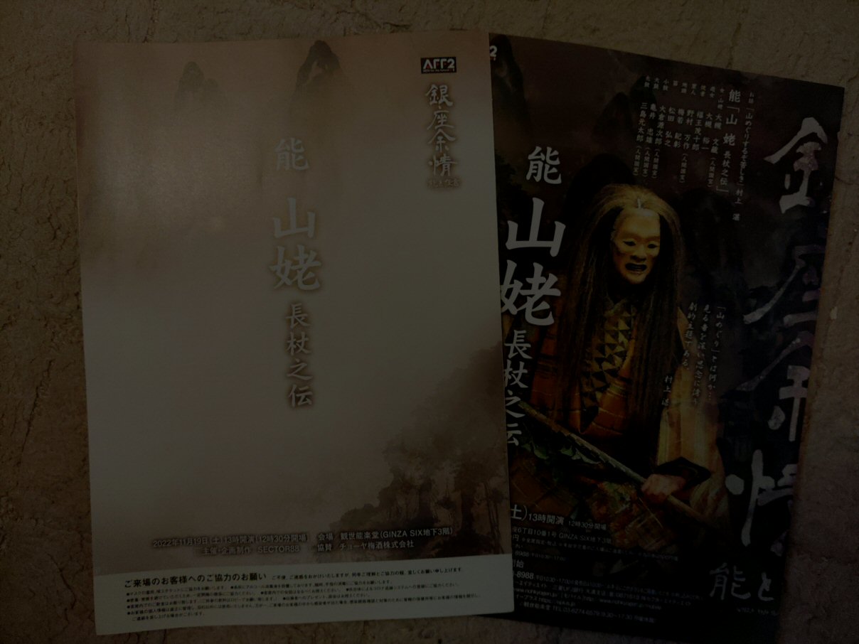 銀座にある観世能楽堂に『能 山姥 長杖の伝』を見に行きました。開演を椅子に座って待っていると、シテって何かしらね、という隣からひそひそ話の声が聞こえてきます。ぼくは主人公のことです、とは答えませんでした。見始めればすぐに分かりますからね。村上湛さんの解説の後、能が始まります。村上さんはこうおっしゃます。