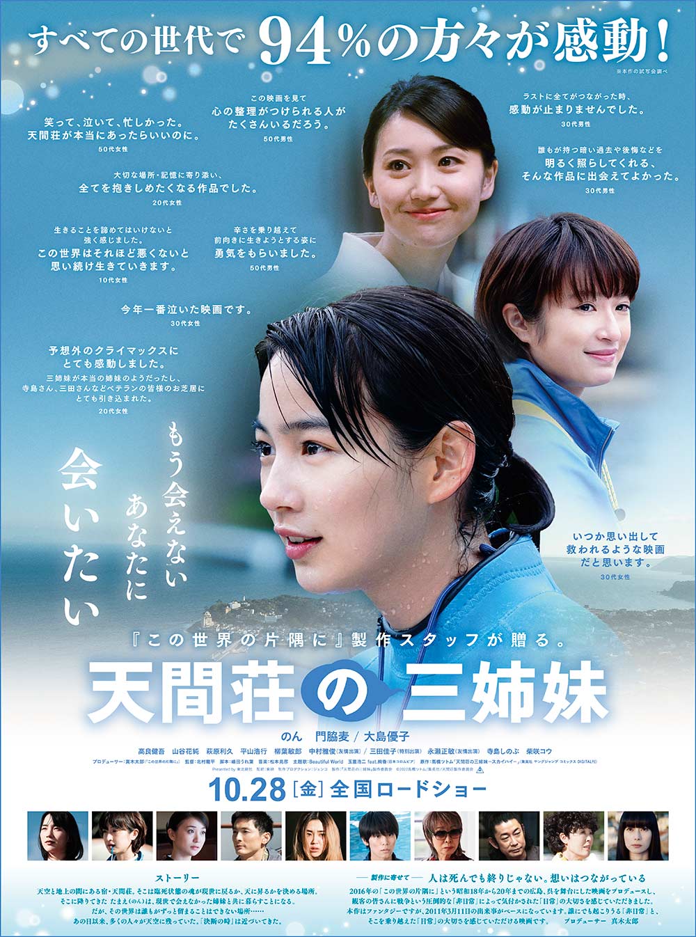 北村龍平監督の『天間荘の三姉妹』を見ました。『天間荘の三姉妹』という題名から往年の成瀬巳喜男監督やら小津安二郎監督らの映画みたいな映画かなと想像していたが、まったく違っていた。高橋ツトムさんの原作を知らないぼくにとって、後半一時間はあっと驚くストーリー展開でした。この前、見た『秘密の森、その向こう』に通じる場所の持つ記憶みたいなについての映画でもあるような気がしました。この映画の舞台の「三ツ瀬」は世界のどこかにあるとぼくは信じて疑わない。