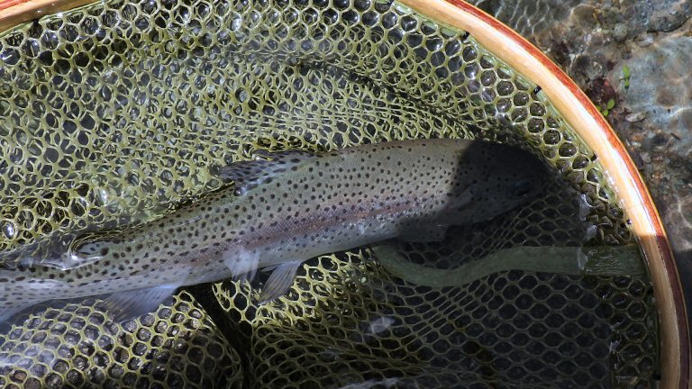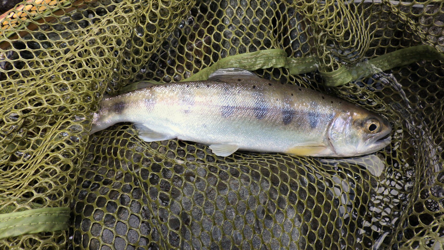 あっ、魚がいると思いその方へ毛鉤を投げると、その魚がいるところとは別のところで、引きを感じ、釣りあげられました。毛鉤はマシュマロカディス。山女魚の保護色でぜんぜん分からなかった。弱って流されていく山女魚も見て、尻尾のところに鳥の爪の傷痕があって、もう少し、このエリアに人が入ったほうが鳥よけとしていいのではないか、などとも思う。その後、虹鱒もマシュマロカディスやテレストリアルの毛鉤で、ゾーンに入ったかのごとくたくさんかかって、このエリアでこんなのは初めてです。楽しかった。