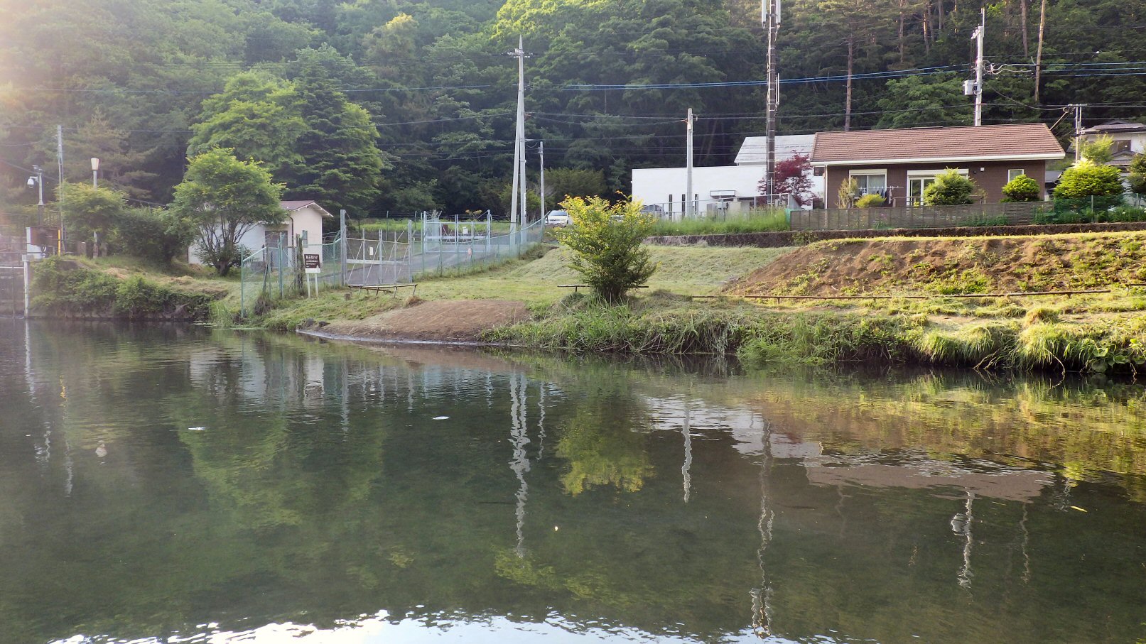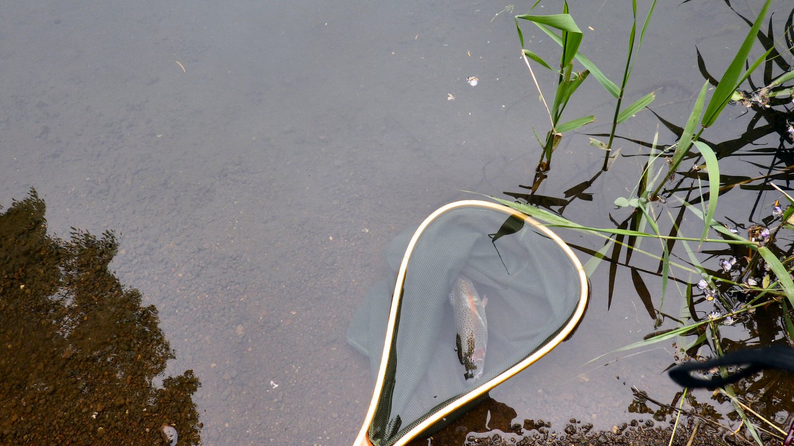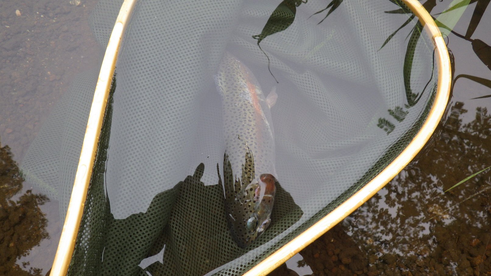 1日目の桂川での夕まずめがはじまったころ、魚が盛んにライズをし始める。いろんな小さな浮くドライフライの毛鉤をライズの辺りをめがけて毛鉤を投げ込むけれど、数回を除いてすべて、魚たちに無視され、無視されなかった数回も簡単に見切られてしまう。小さなゲジゲジみたいな沈むニンフフライの毛鉤を投げ、下流に流れ切り、ゆっくりひっぱたら、釣れました。尺越えではないけれど、それなりの大きさ虹鱒でした。写真を撮ろうとして、その前にネットの中で毛鉤を外すと、ぴょんと魚は跳ね、魚は逃げてしまい、写真は撮れませんでした。確か、養沢毛鉤専用釣場で初めて釣れた時も写真を撮り逃してしまったな。釣って放つ。