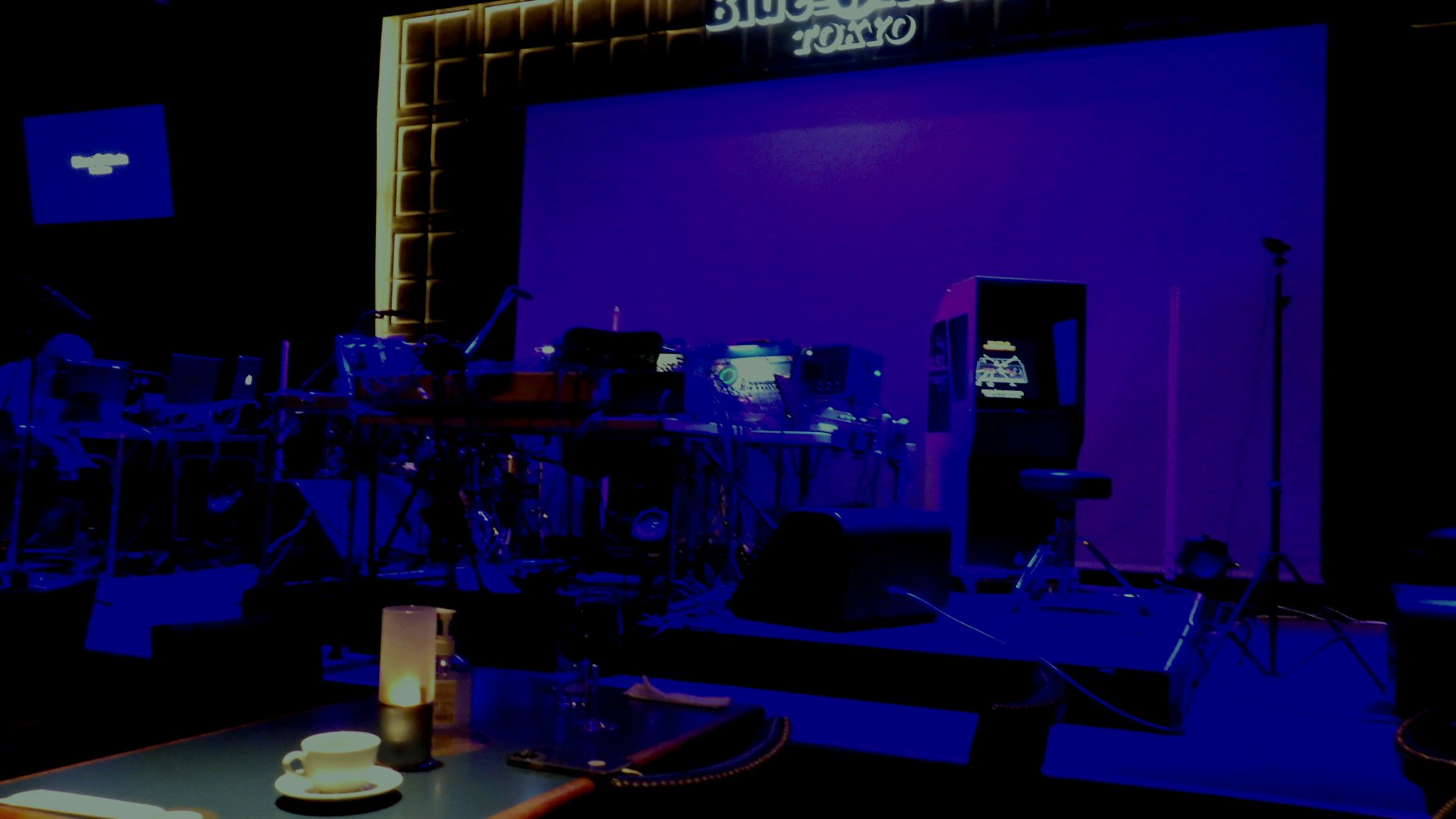 ステージに立ち並ぶオールドスタイルの電子機器に「レトロフューチャー」などという言葉が思い浮かぶ。ヤン富田さんって滅多にコンサートとかってやらないんじゃない? 古いアーケードゲームもある明滅する電子機器にワクワクしてくる。