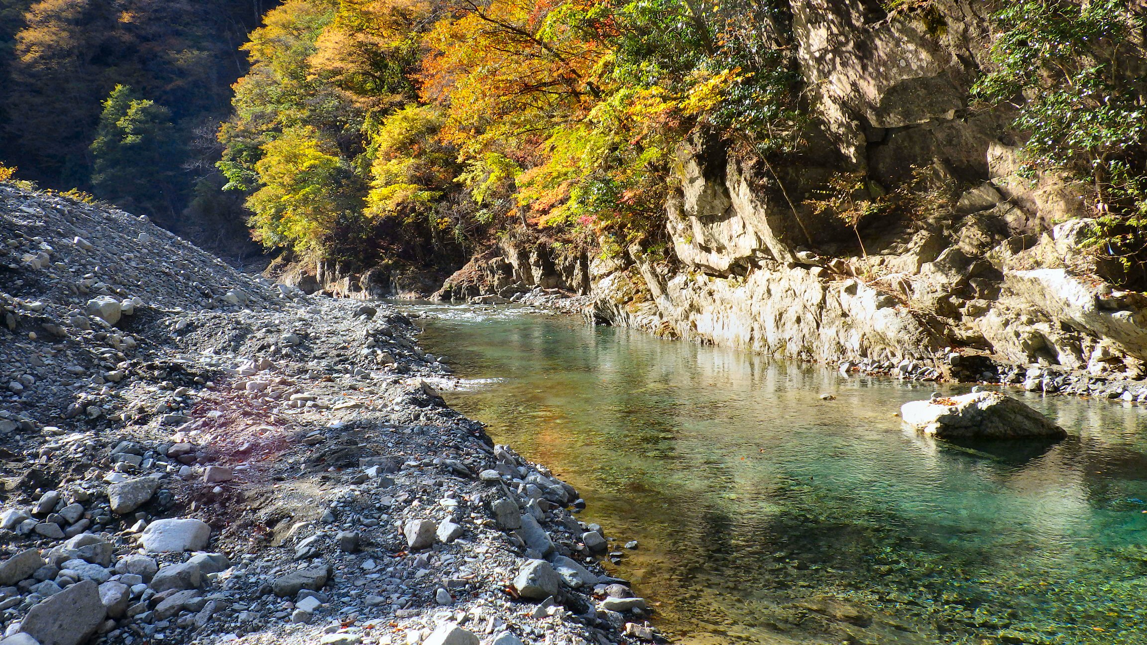 後から考えれば、人の姿を見た鹿が、非難せねばと考え、あの川の向こうの狭い岩場に行ったのかもしれず、怖がっていたのは鹿の方かもしれません。あの決して目をそらさない、大きな黒い野生の鹿の強い視線が今でも、まざまざと思い出され、忘れられません。野生の生きものは素晴らしい、そう思わずにはいられません。ぼくは夏の終わりにここで、ヤマカガシという赤い蛇を見たこともあります。そう、野生の生きものは素晴らしい。