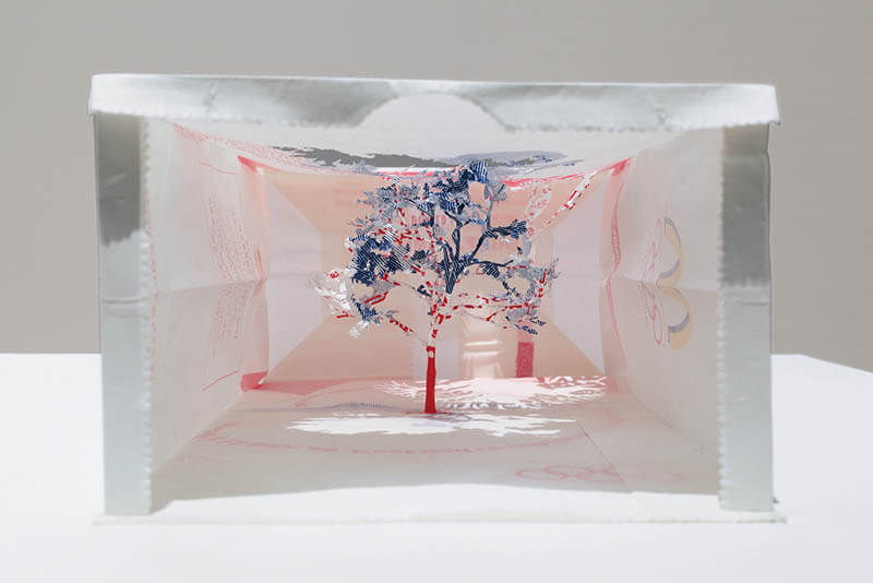 併設されていた『Journals 日々、記す』展もおもしろかった。この『Journals 日々、記す』展の照屋勇賢さんのマクドナルドの包装紙を切り抜いて、ニューヨークのマディソンアベニューの実際に生えている樹木を造形したいくつもの作品を見ていたら、感動して、鳥肌が立ってきていた。これらは照屋さんによれば「高校生の時に授業で聞いた「どんぐりには樫の木の記憶が入っている」というアリストテレスの自然哲学を思い出し紙袋の中で眠っている森を呼び覚ましてやろう、と考えた」ということだそうです。これらは二十一世紀のアクチュアルで、未来すらも呼び覚ます概念の具象だとも思いました。