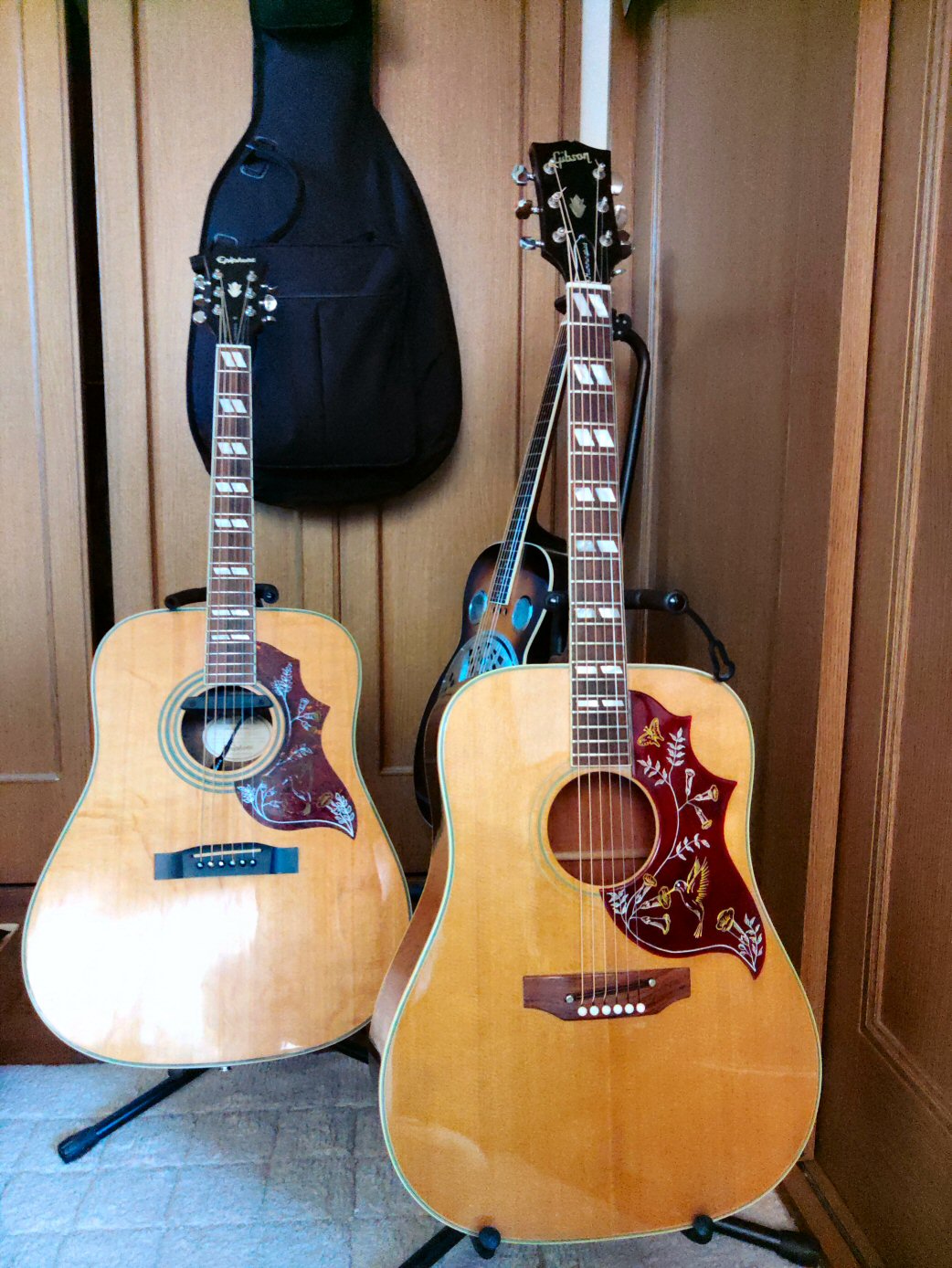 中古のギターを買いました。いかにもギターマニアの店員さんによると1968年か1969年製造のGibsonのHummingbirdということ。写真の手前のがGibsonのHummingbirdで、後ろのがEpiphoneのHummingbird。このギターたちをHummingbird Brothersと呼びます。