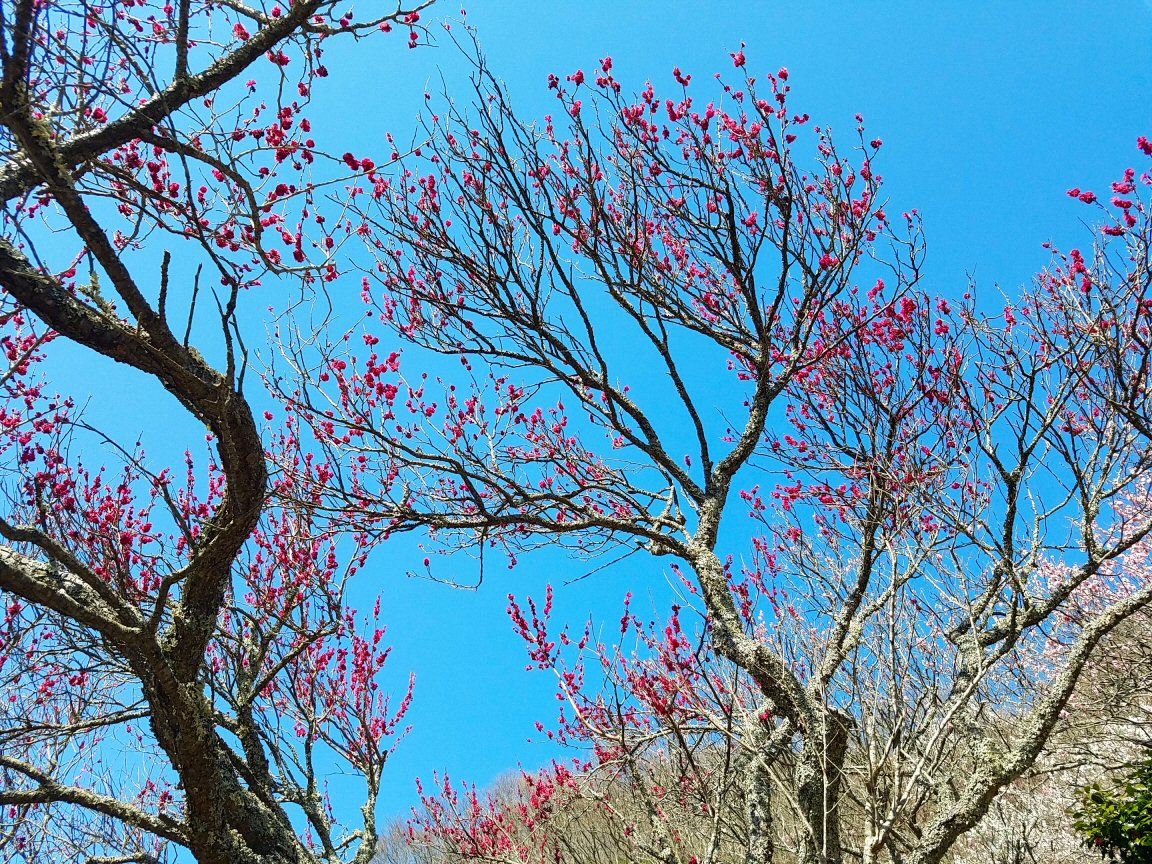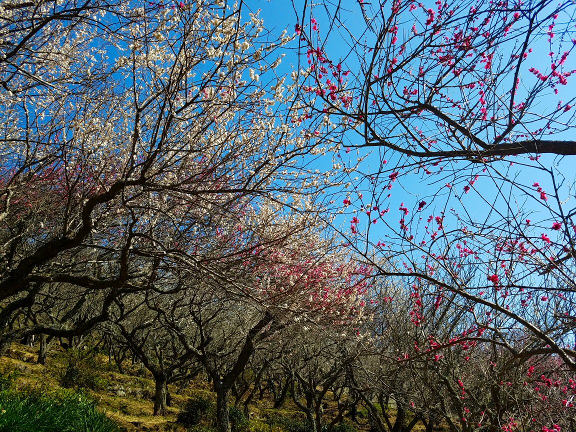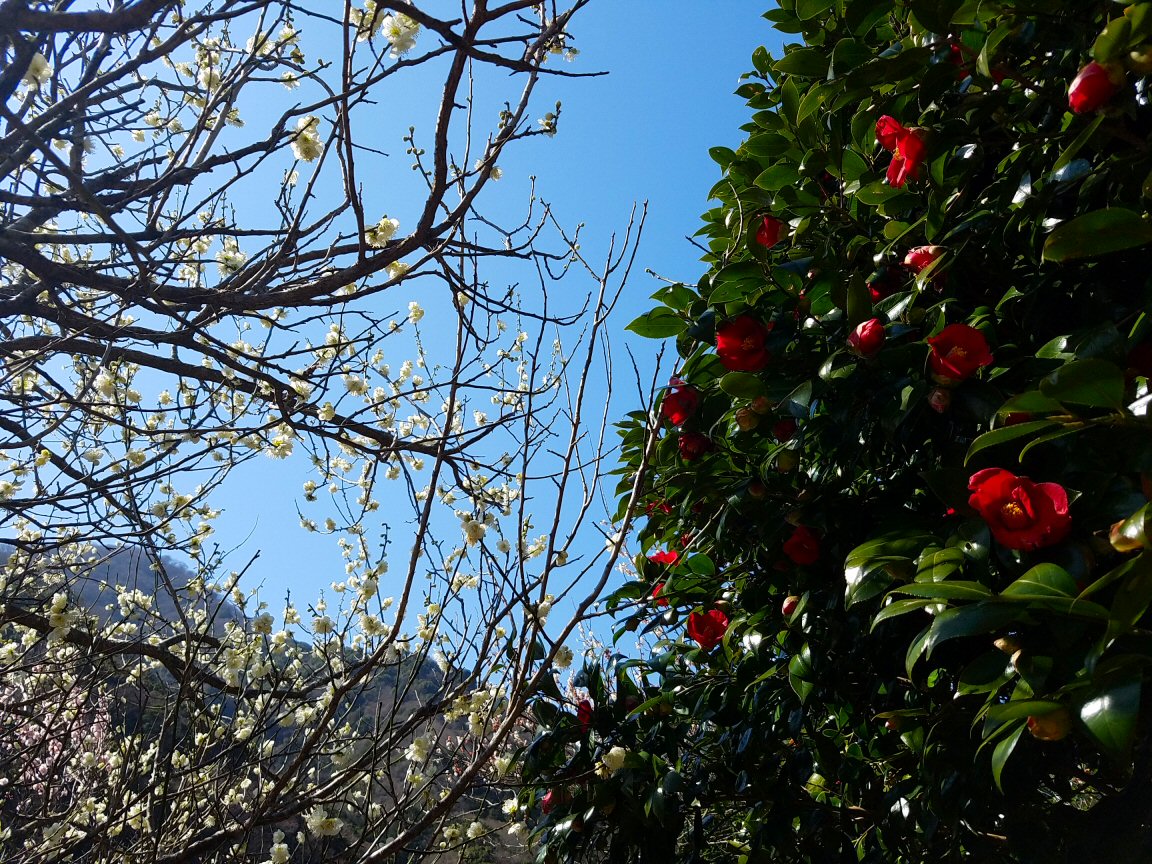 そして、梅の花がきれい。梅林に美しい鶏も歩いている。風情があります。