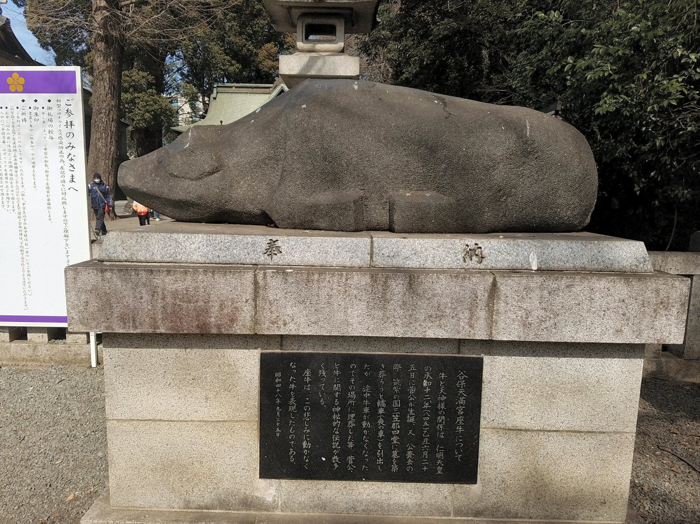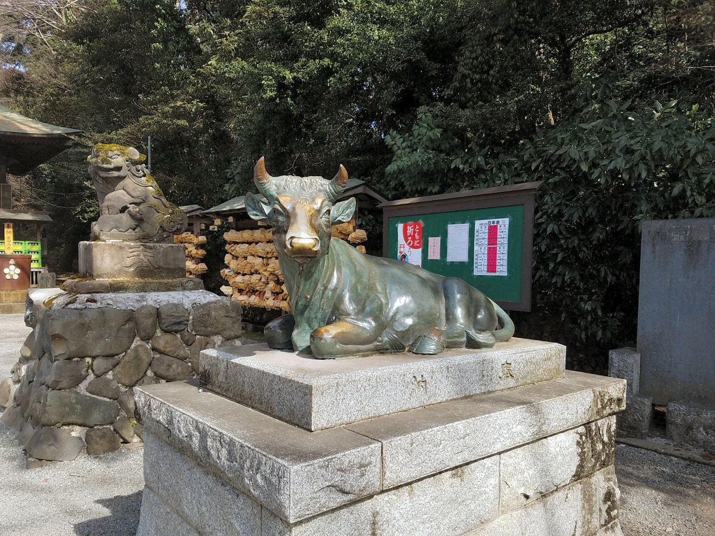 天満宮ですから、菅原道真を祀っており、梅の木があり牛の像がありますな。谷保天満宮には二体の牛の像があり、とくに神社の鳥居の隣にあった座牛像が、ぼくは、なぜか惹かれました。この座りこんだ牛は、関敏の作で菅公葬送のとき、悲しみ動かなくなった牛車の牛を現すのだそう。この像を見て、ぼくの感じた清らかな悲しみは、スマホのカメラでは写し取れませんでした。