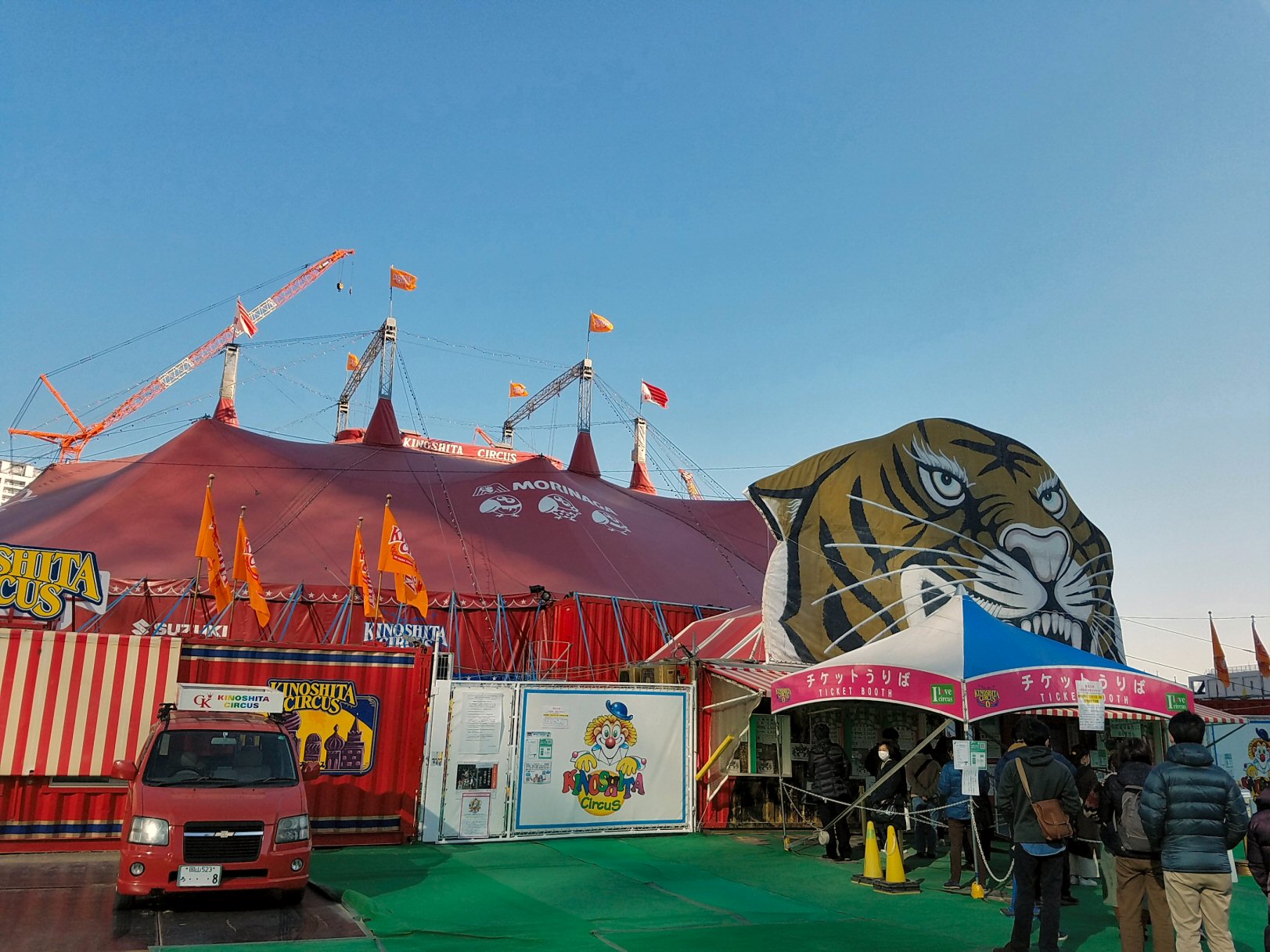 いつか、サーカスを見てみたい、と思っていたのですが、アンパンマンこどもミュージアムの隣にテントを張ってる木下大サーカスを見に行きました。10時10分からのショーに8時半から並んで、なんとリングサイドの一番前の席が取れました。