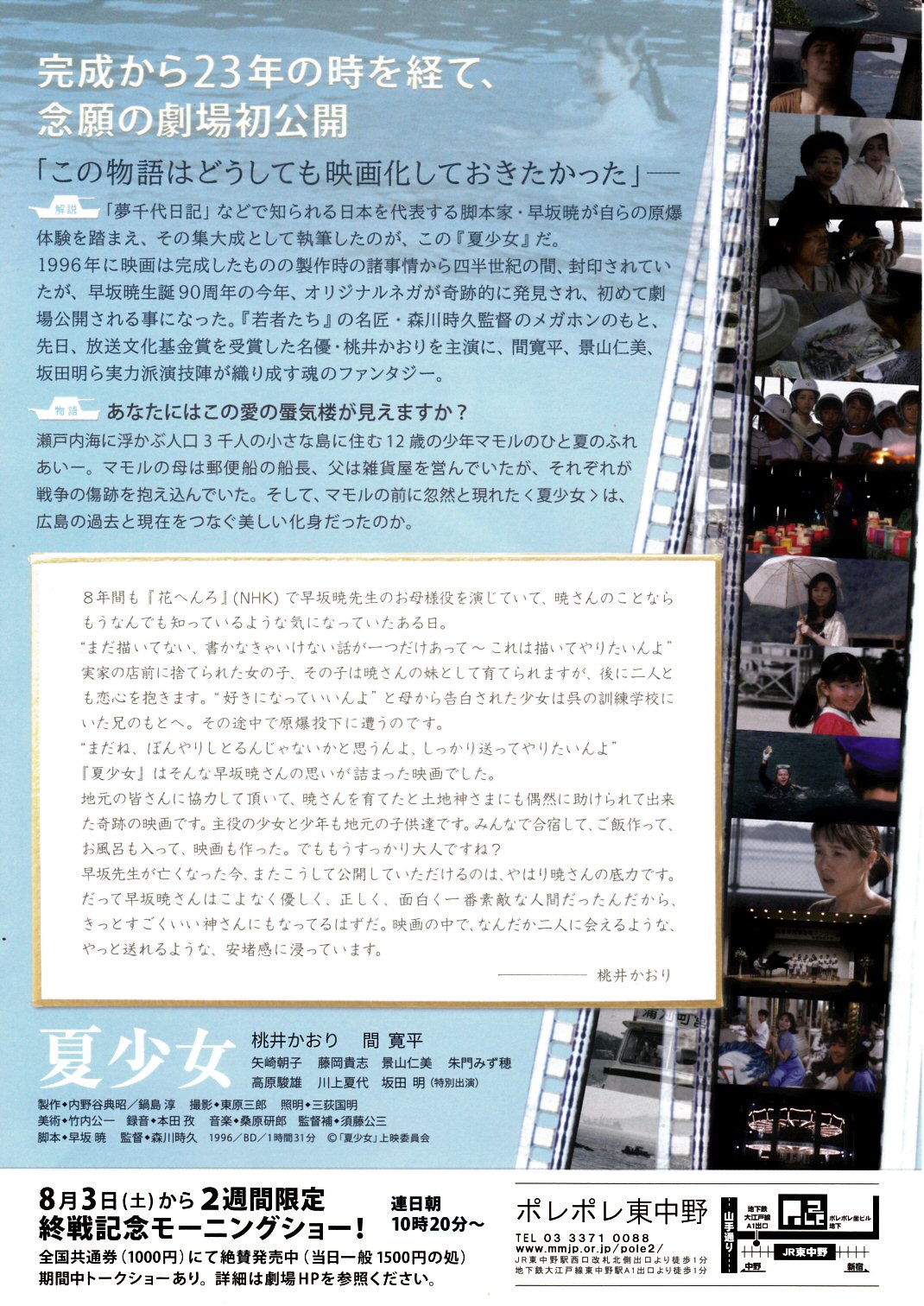 ポレポレ東中野で23年前に作られて長らくある事情により公開されなかったらしい森川時久監督の「夏少女」を見ました。公開されなかったある事情とは何となく察しというか、想像できるみたいなのだが、戦争の記憶が日本から薄れていくような今、公開されてよかったとも思う。