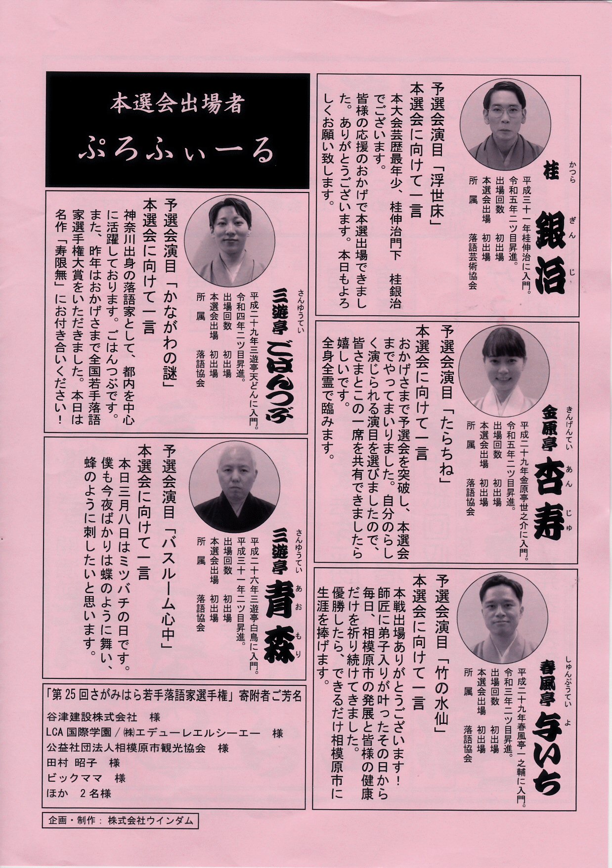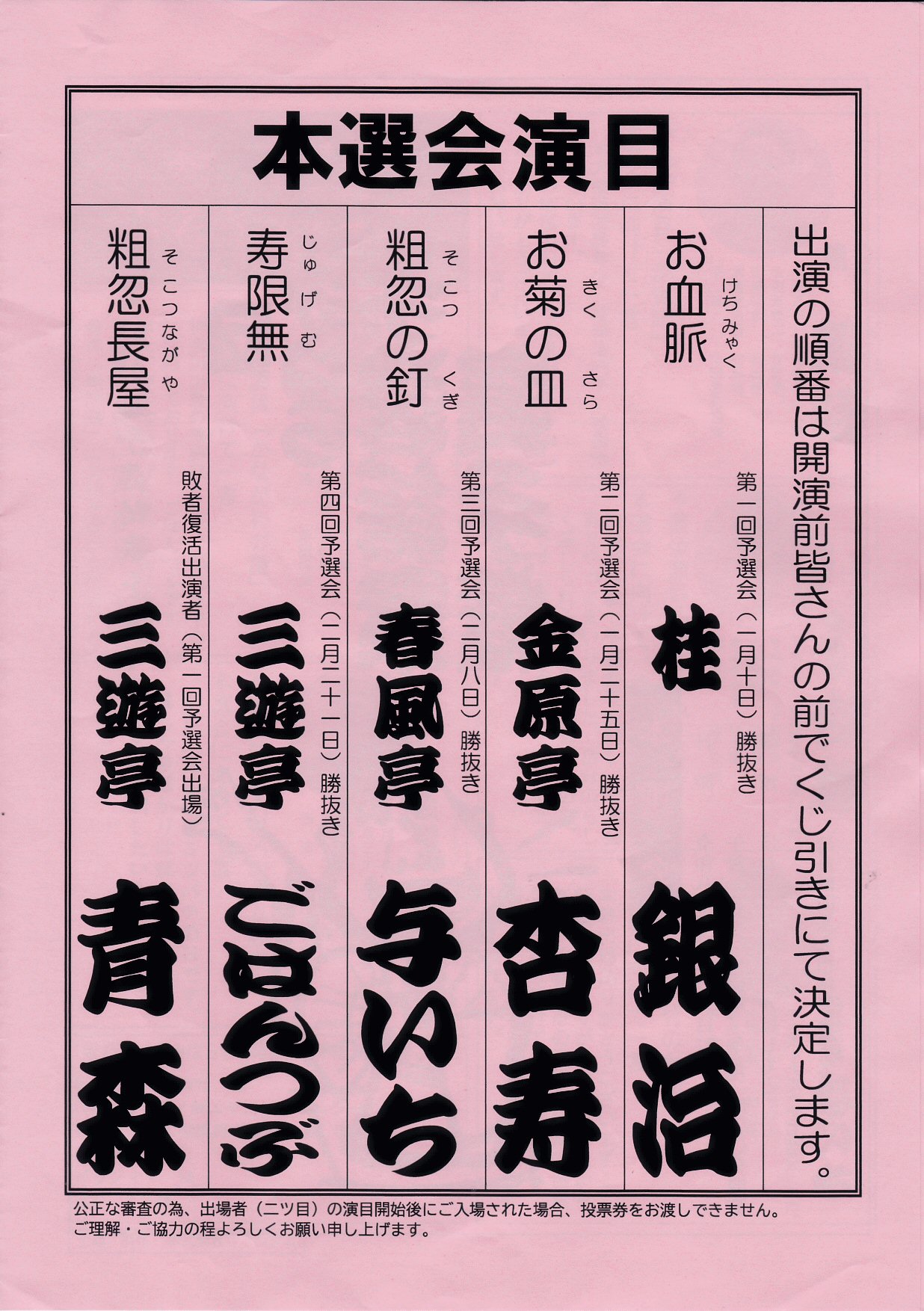 第25回さがみはら若手落語家選手権本選会です。見た演目です。前座の柳亭すわろうくんの「らくだ」、二ツ目の春風亭与一くんの「粗忽の釘」、二ツ目の金原亭杏寿さんの「お菊の皿」、二ツ目の桂銀治くんの「お血脈」で休憩となりました。二ツ目の三遊亭ごはんつぶくんの「寿限無」、二ツ目の三遊亭青森くんの「粗忽長屋」でした。その後、お客さんの投票があり、ゲスト落語家の鈴々舎馬るこ師匠の噺は「置き泥」でした。
