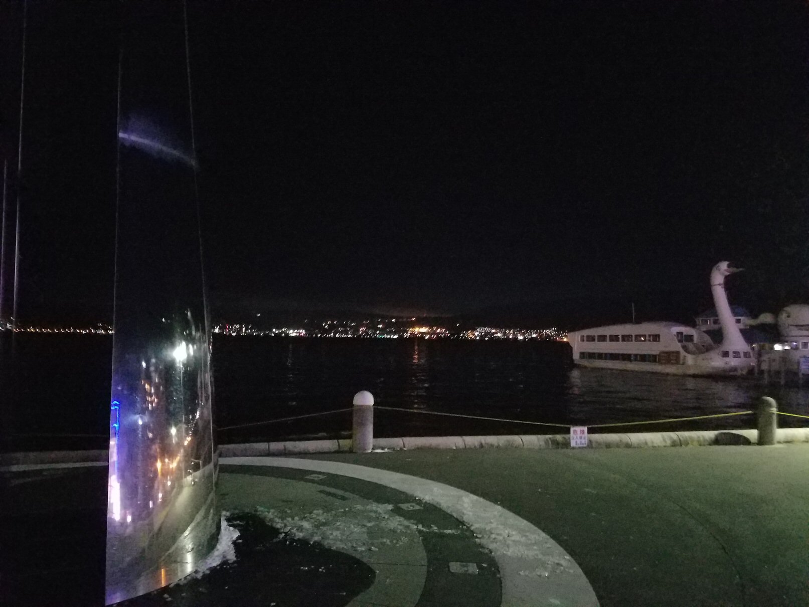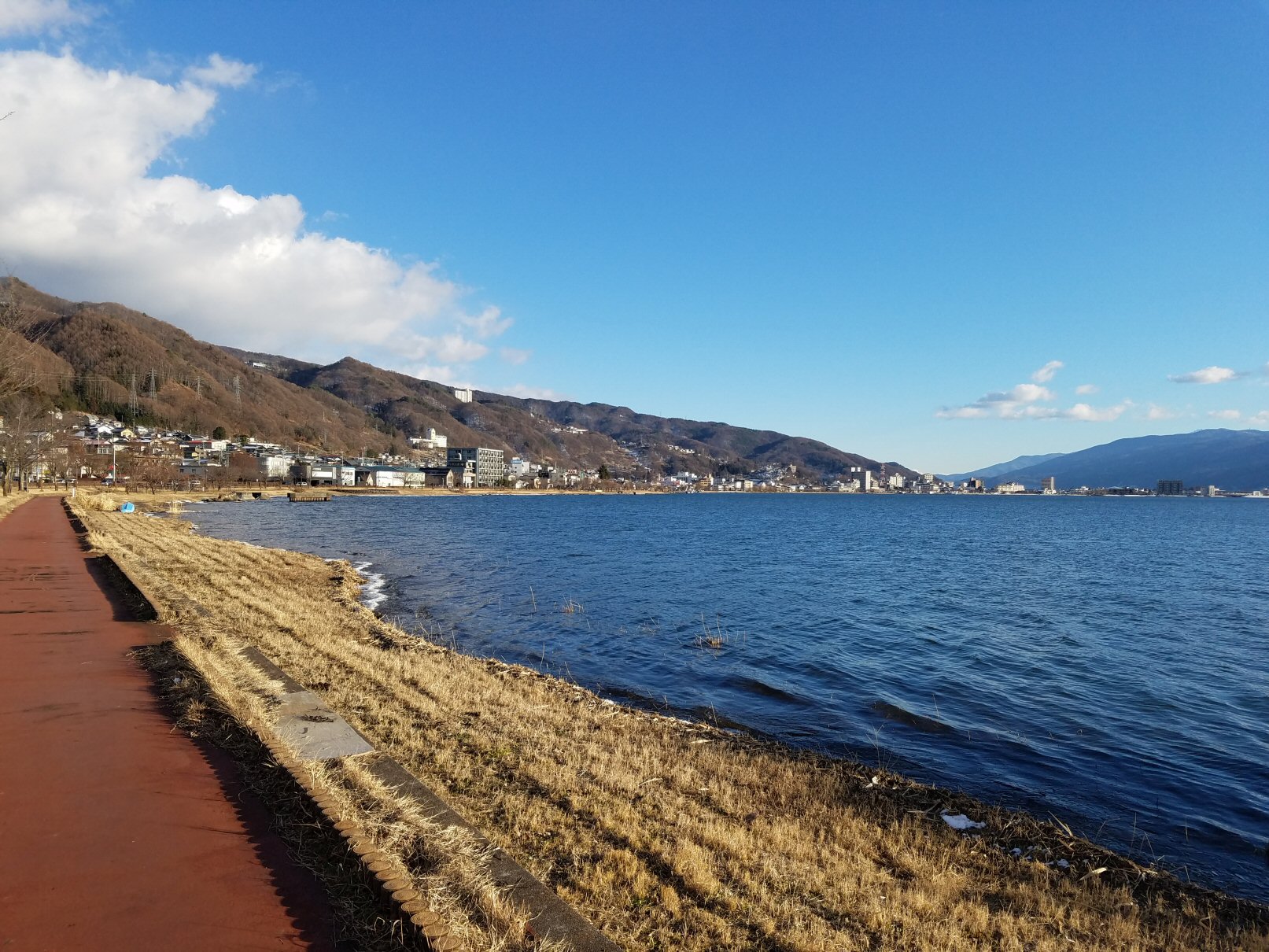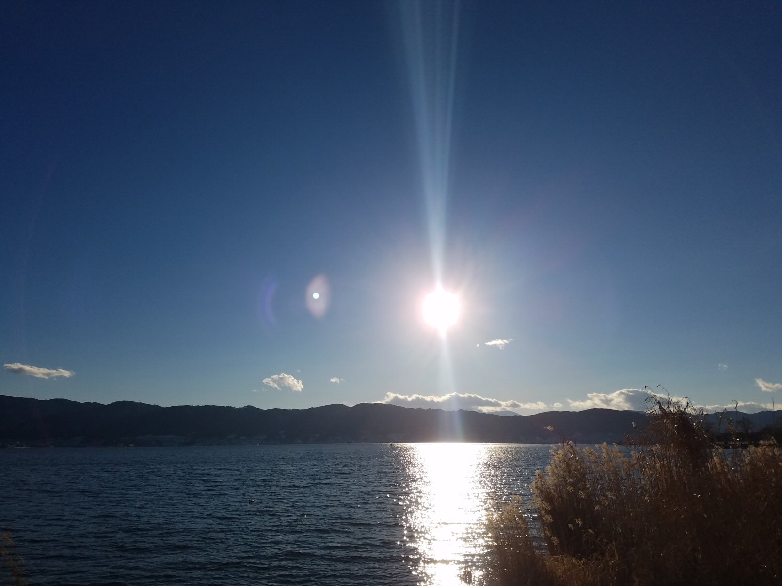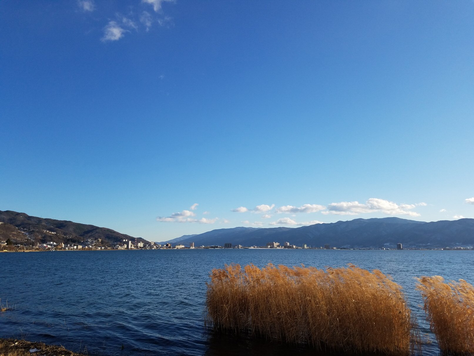 夜の諏訪湖です。いつか見たい「御神渡り」(諏訪湖#御神渡り - Wikipedia:https://bit.ly/2TsgaCh)のことを思いまする。