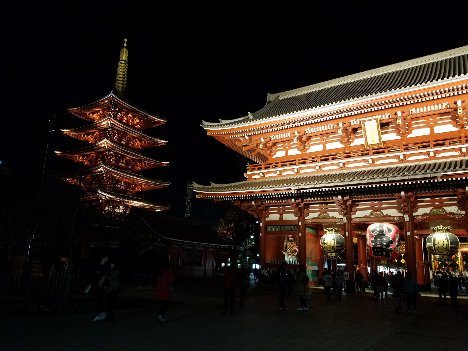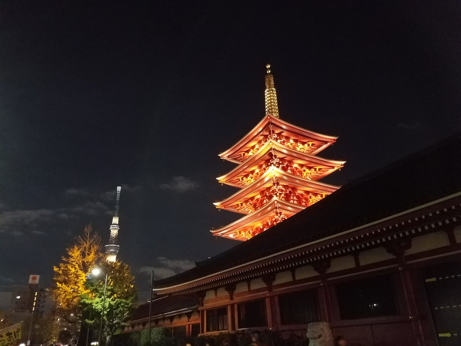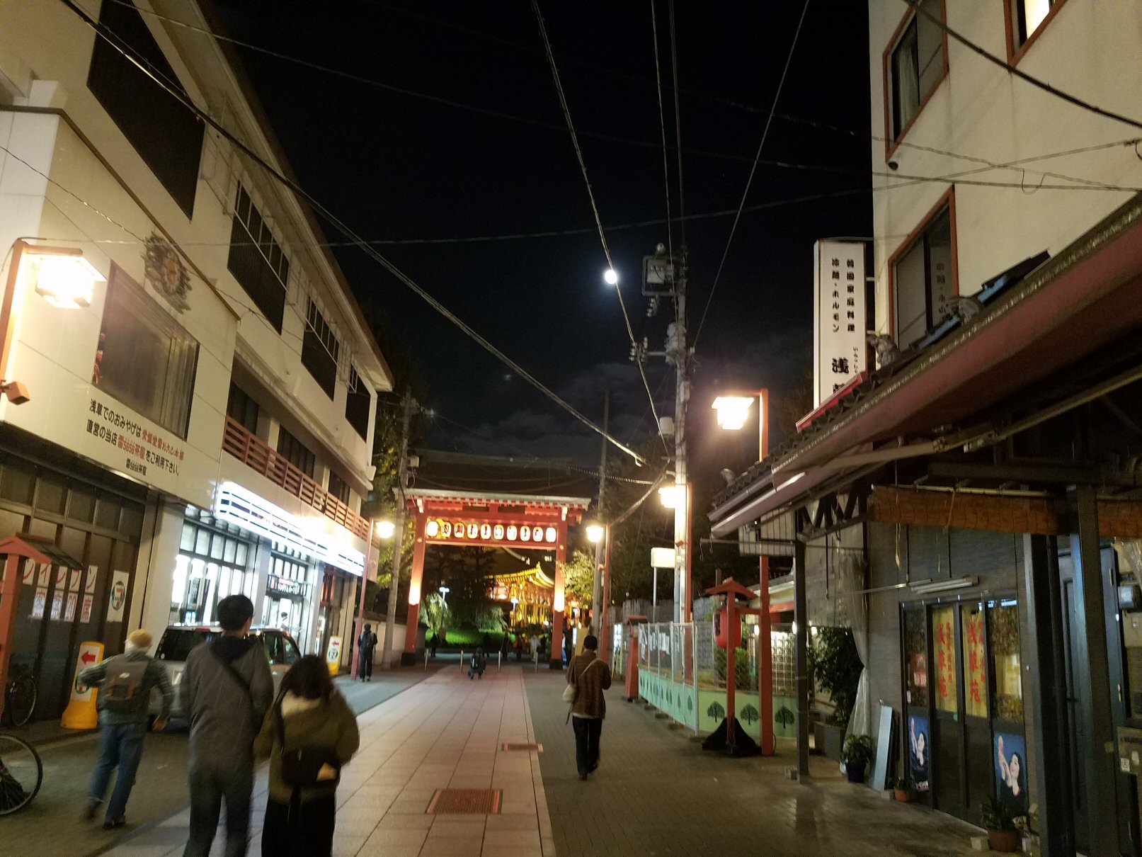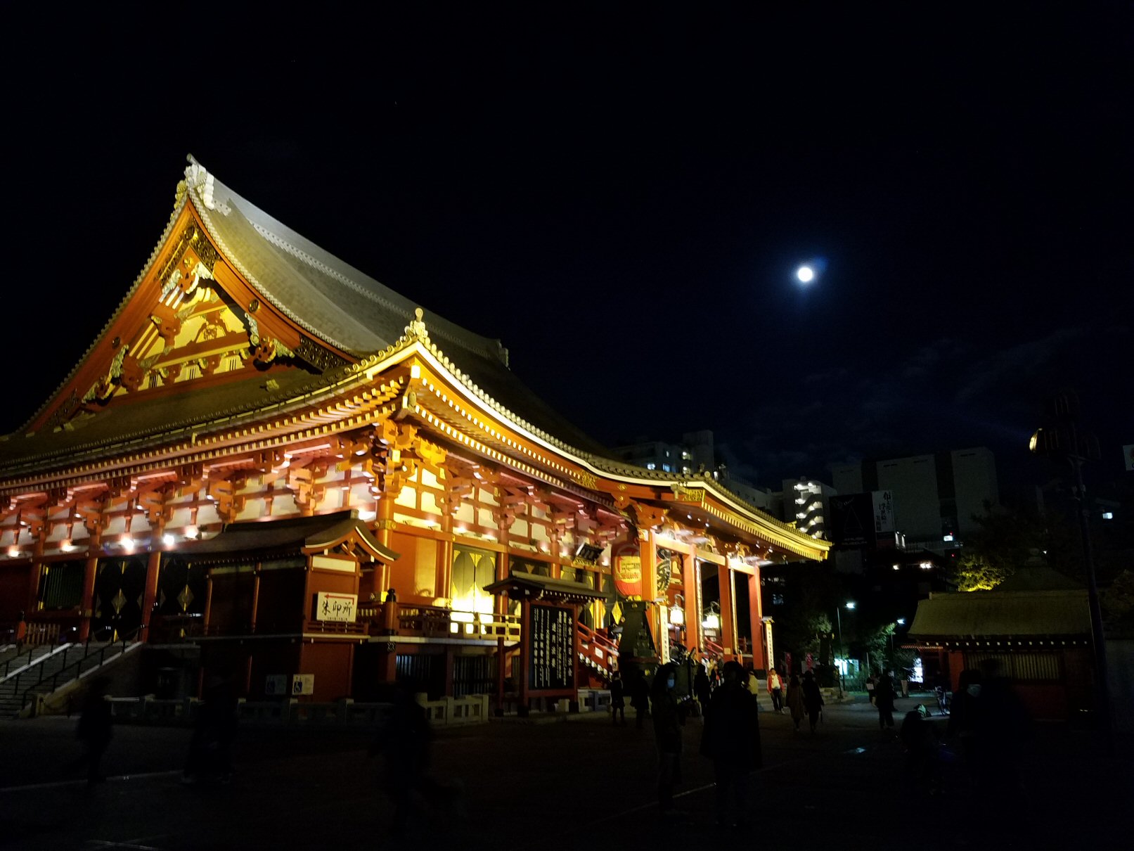 外に出ると向こうの方に浅草寺とまん丸いお月さま。