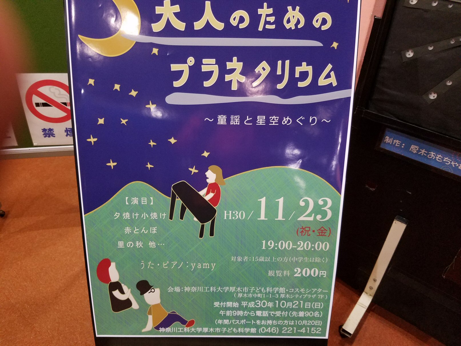 帰りに本厚木駅で途中下車して、「神奈川工科大学厚木市子ども科学館・コスモシアター」という長い名前のプラネタリウムで、yamyちゃんがピアノを弾き語りする「大人のためのプラネタリウム」というコンサートを楽しみました。yamyちゃんは「赤とんぼ」とか「里の秋」などの童謡、加藤登紀子さんのアニメ映画「紅の豚」の主題歌でもある名曲「時には昔の話を」などを歌ってくれましたが、特にオリジナルの「春待つ桜」という歌は、喪失の隣にしかない希望みたいなことを歌っていて、胸にじーんときて、よかったな。