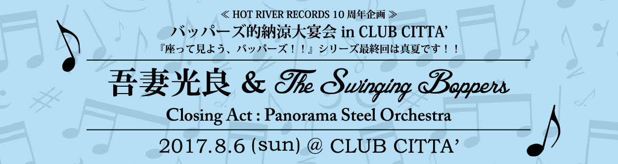 川崎のクラブ・チッタに 吾妻光良&The Swinging Boppersを見に行った。ぼくは彼らの結成以来のファンなんです。メンバーの顔を見れば、頭髪が白くなったり、薄くなったりしているのですよ、吾妻さん。感慨もひとしおですな。初めて、アナログ盤の"Hepcats Jump Again"を聴いた時は衝撃的でもありました。