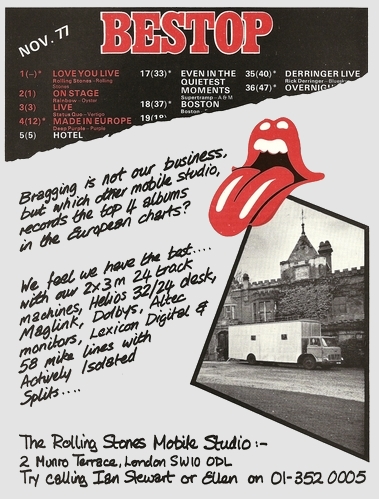 そう言えば、ローリング・ストーンズは"The Rolling Stones Mobile Unit"という移動できる巨大なPA兼レコーディングスタジオを持っていて、1970年代、1980年代にいろんなミュージシャンやバンドに貸出しをし、その機材を使って録音されたたくさんの名盤も残っている。ぼくが昨夜、聴いていたルー・リードの"Live In Italy"がそうだし、Bob Marley And Wailersの"Live!"なんかもそうであったのを思い出した。