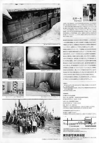 東京都写真美術館で「北井一夫 いつか見た風景」展を見た。懐かしい既視感のようなもので胸がじんじんと騒ぎ、目がうるうるしてしまいました。写真って、その基本は好きなものを撮るってことなのかなあ、と思った。北井一夫さんの写真って、どこにでも旅している感じとカメラを向ける北井一夫さんの心の目線がとても低くからなのが、ぼくにとってとてもいい感じなのです。アメリカにロバート・フランクという写真家がいましたね、日本に小津安二郎という映画監督がいましたね、そんな人たちのことを思い出した。