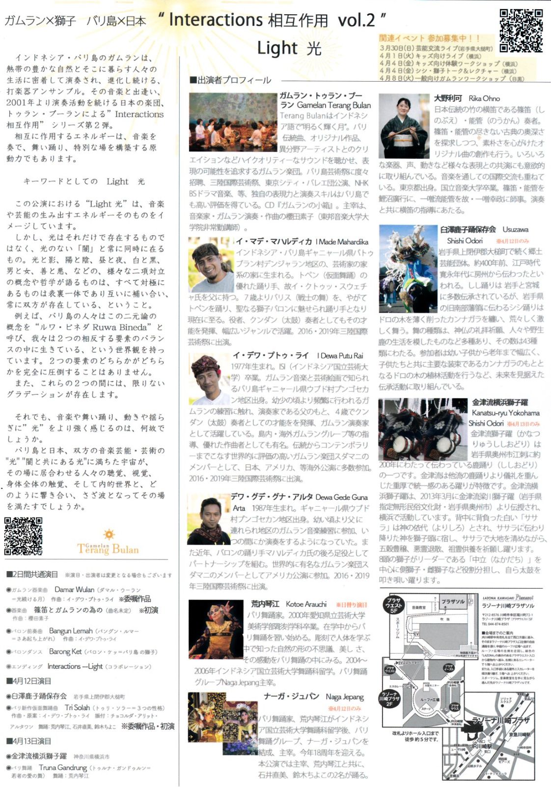 横浜のガムランのチーム、トゥラン・ブランにバリ島からのゲストが入っております。ガムランの金属楽器の音が場内に響きわたり始めると鳥肌が立つかのような何ともいえない驚きの感動をおぼえます。生の演奏にまさるものはありません。篠笛の大野利可さんの演奏も入ります。バリ舞踏の荒内琴絵さんの舞いも入ります。このバリ舞踏はバリからやって来た人が踊っているのかと、ぼくは思ってしまっていました。素晴らしい。