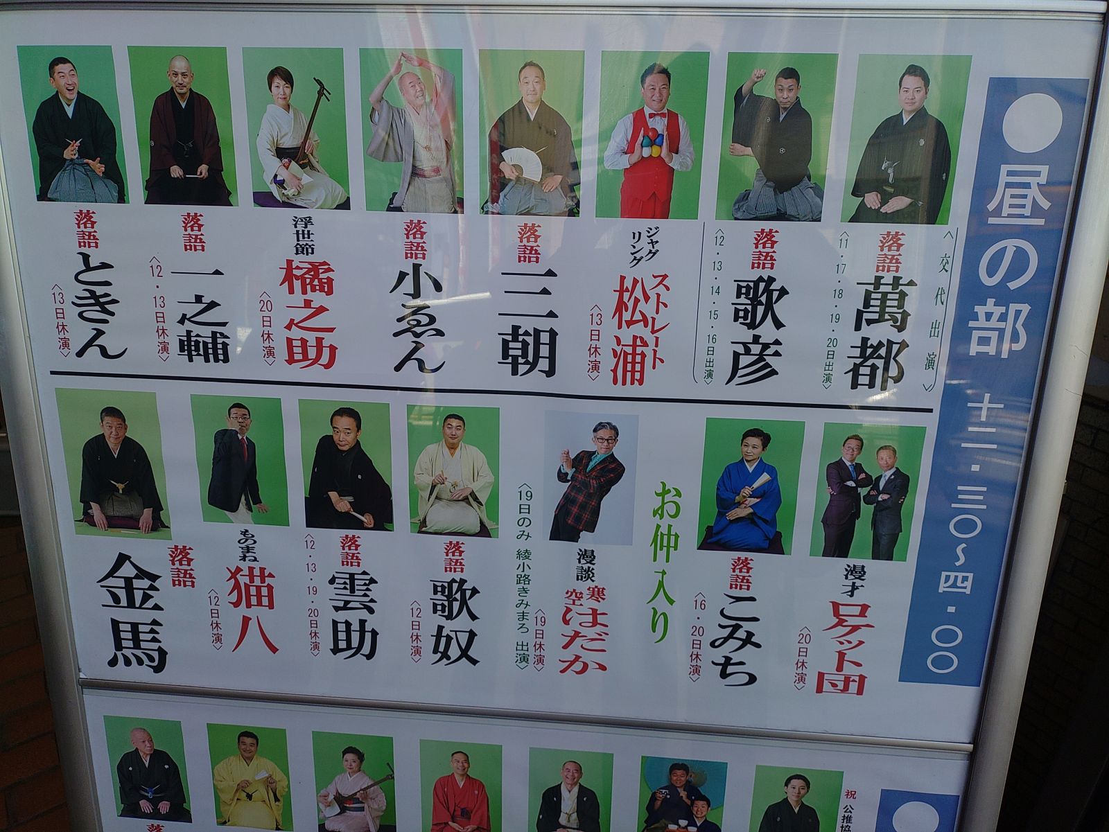 四月十六日、上野の鈴廣演芸場で令和七年四月中席昼の部を見ました。見た演目を書き出してみます。ストレート松浦さんのジャグリング、春風亭三朝師匠の「お花半七馴れ初め」、柳家小ゑん師匠の「ミステリーな午後」、立花家橘之助師匠の唄いの三味線弾きの浮世節、春風亭一之輔師匠の「金の大黒」、三遊亭ときん師匠の「権助魚」、ロケット団のお二人の漫才、柳家わさび師匠の「亀田鵬斎」で仲入りです。寒空はだかさんの漫談、三遊亭歌奴師匠の「子ほめ」、五街道雲助師匠の「強情灸」、江戸屋猫八師匠の動物ものまね、主任は三遊亭金馬師匠の「子別れ」でした。